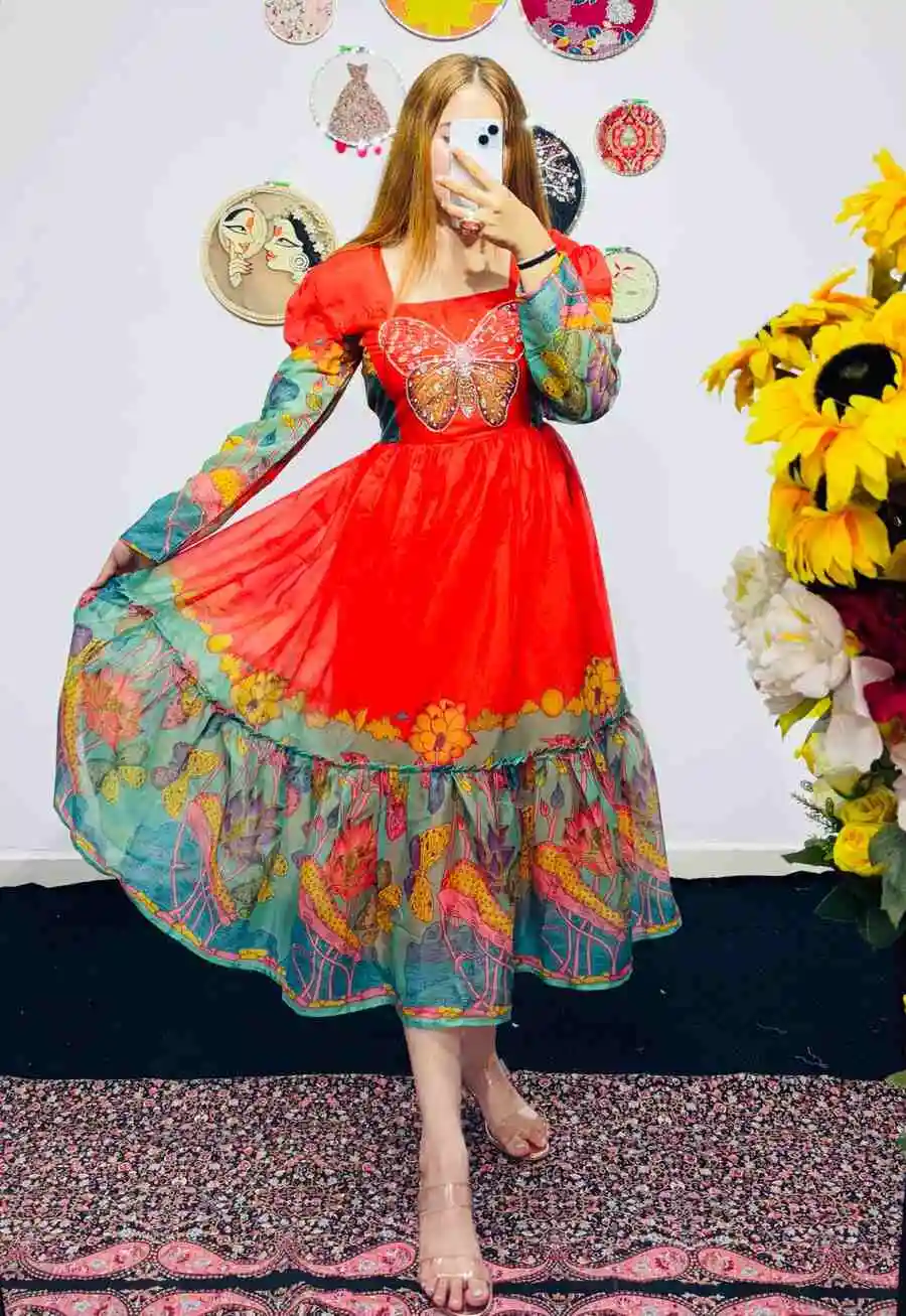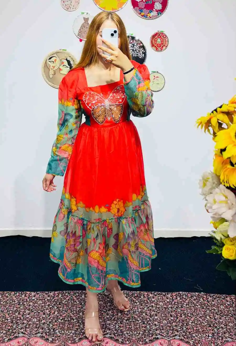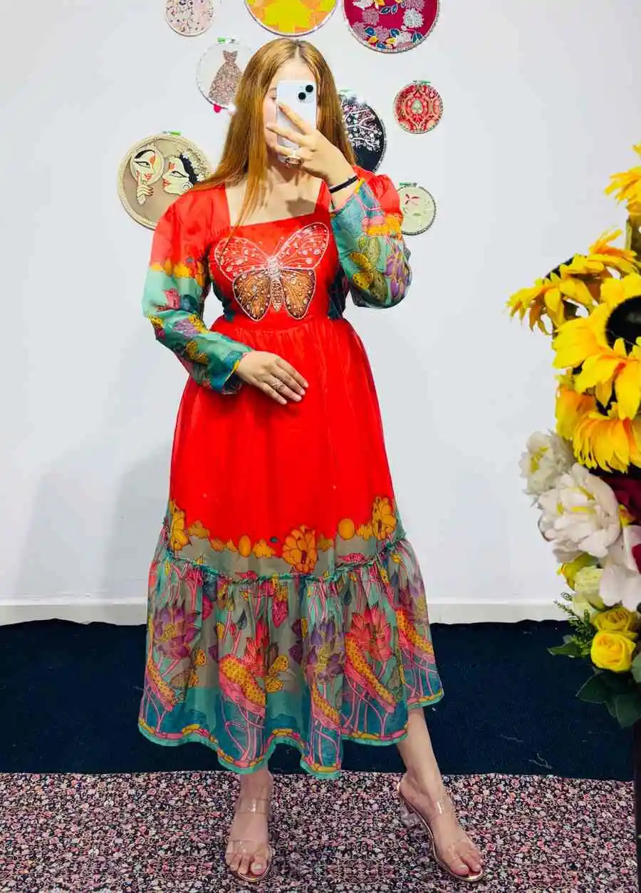 FANCY GEORGETTE HANDWORK ONE PIECE RED