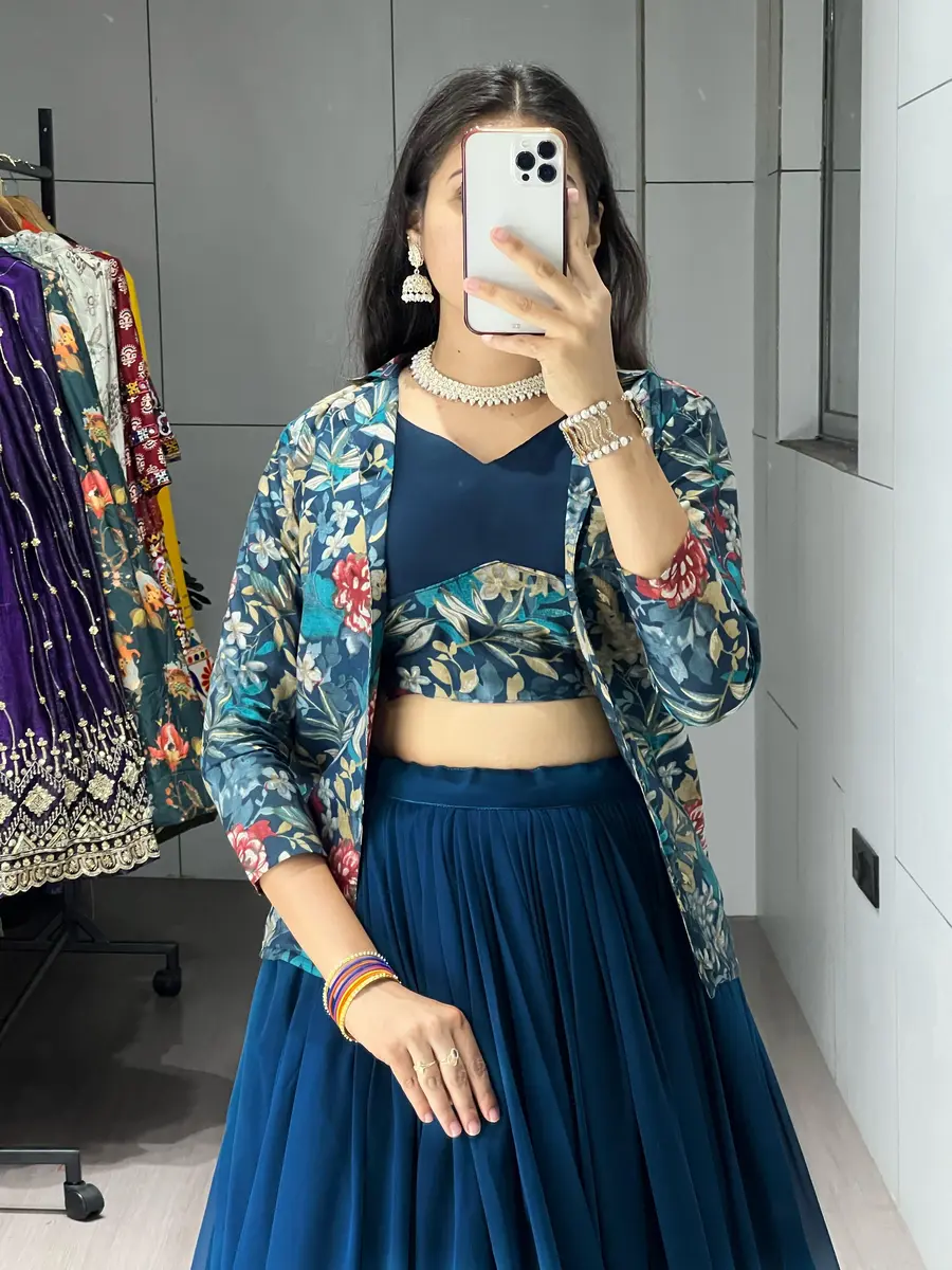 FANCY GEORGETTE PLAIN LEHENGA WITH DIGITAL PRINTED CHOLI AND KOTI TEAL