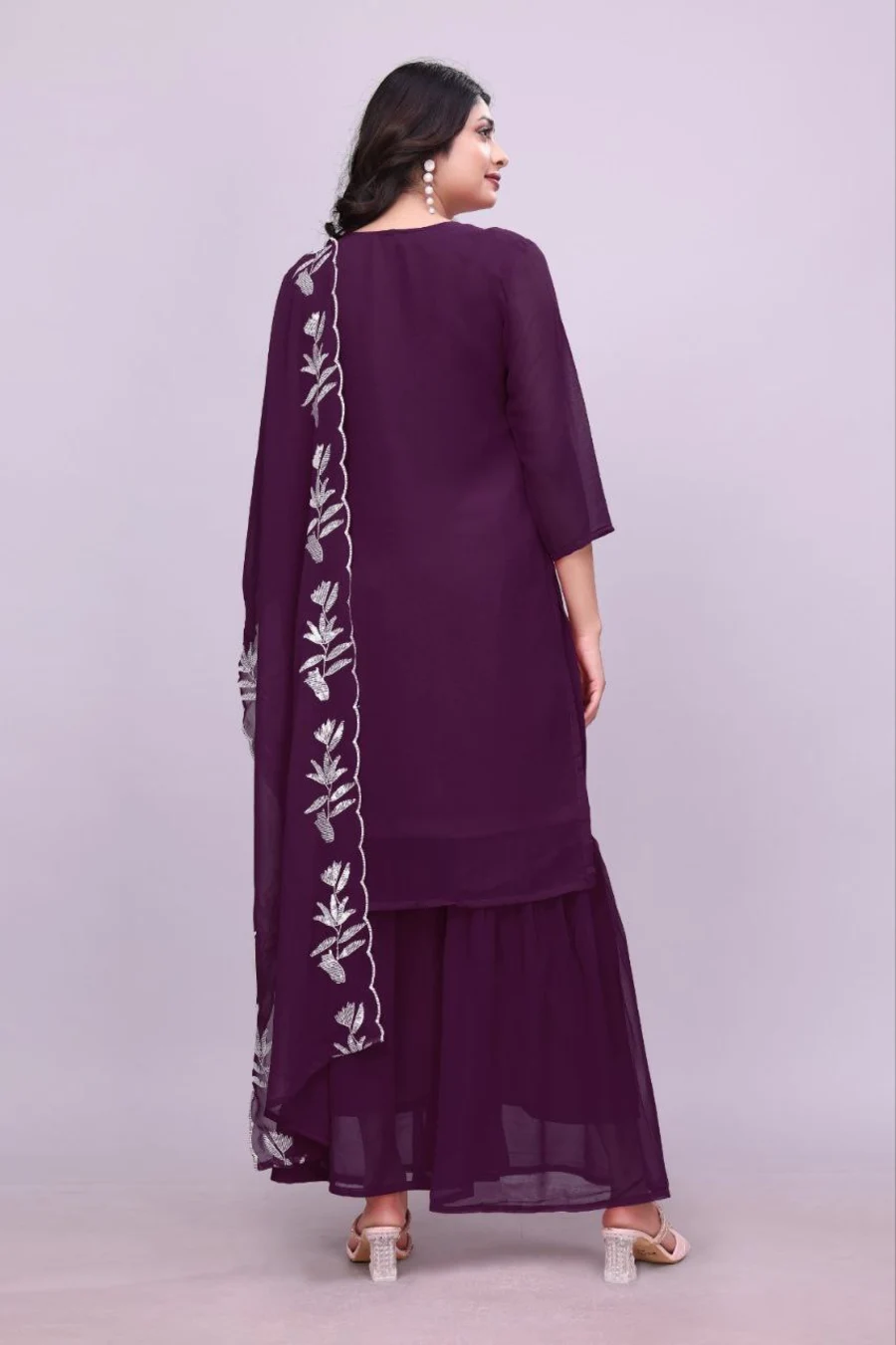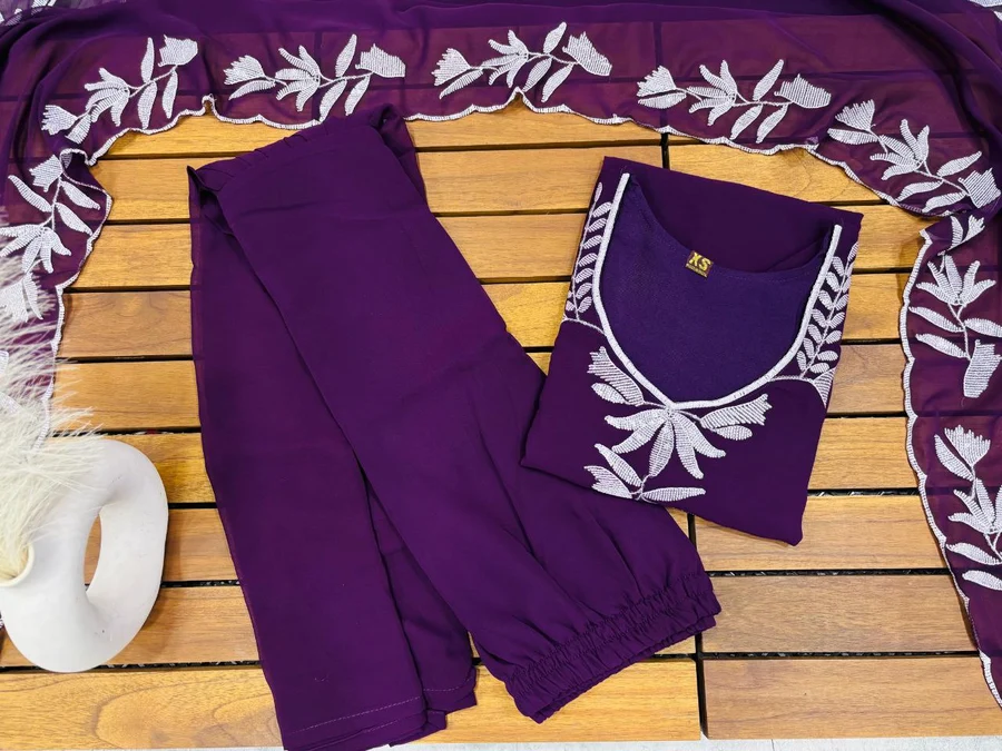 FANCY GEORGETTE SEQUENCE EMBROIDERY WORK TOP SHARARA WITH DUPATTA PURPLE