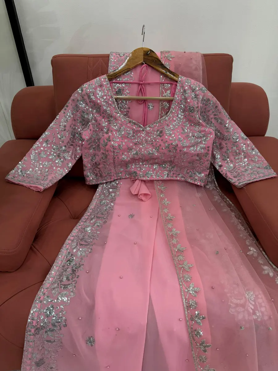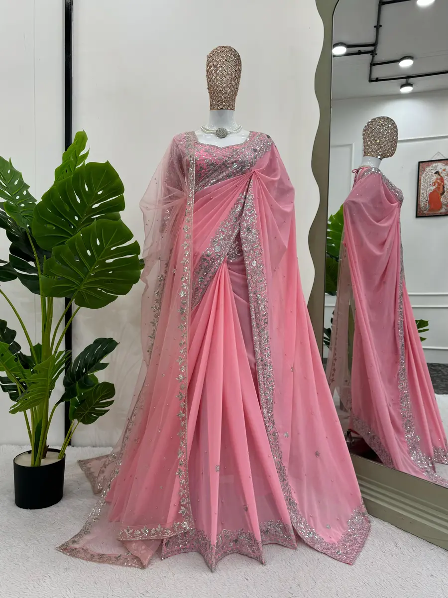 FANCY GEORGETTE THREAD & SEQUNCE WORK WITH PEARL WORK SAFREE WITH UNSTITCHED BLOUSE AND DUPATTA BABY PINK