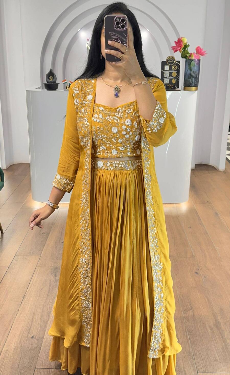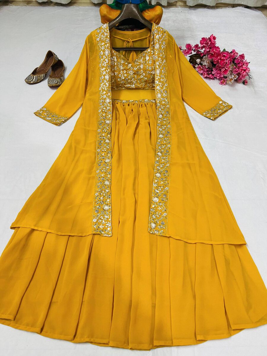 FANCY GEORGETTE THREAD, ZARI & SEQUENCE EMBROIDERY WORK LEHENGA BLOUSE AND SHRUG YELLOW