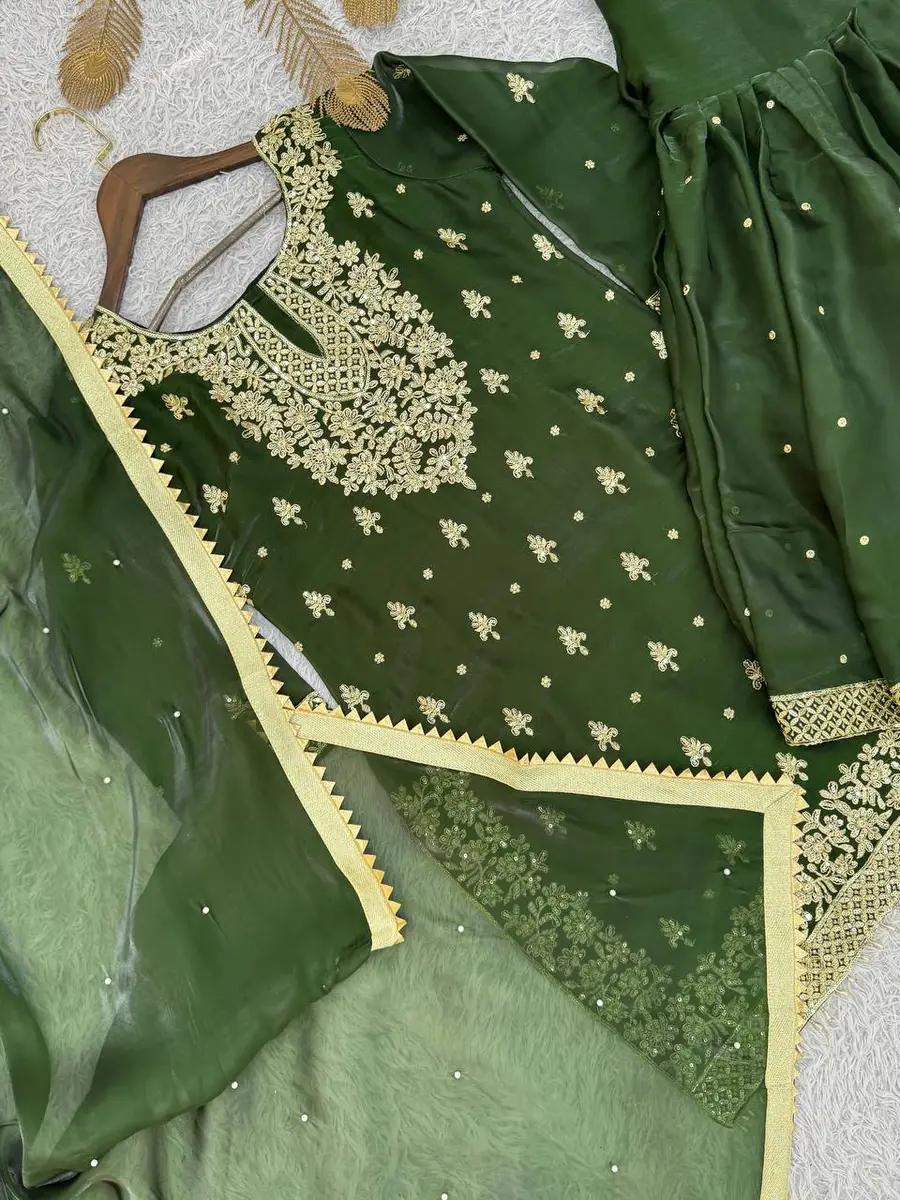 FANCY GMY SILK EMBROIDERY SEQUENCE WORK WITH READY MADE LACE BORDER WORK TOP SHARARA WITH DUPATTA GREEN