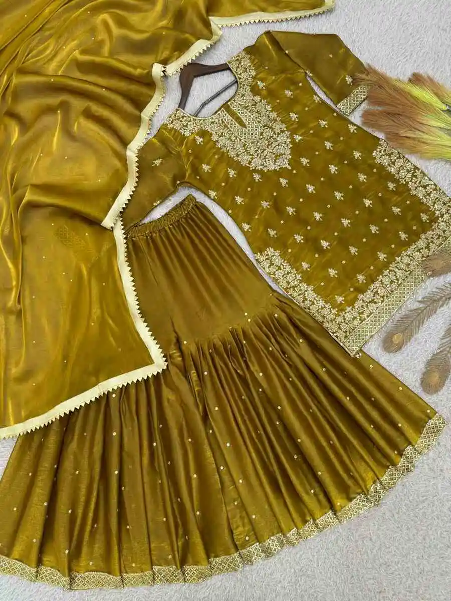 FANCY GMY SILK EMBROIDERY SEQUENCE WORK WITH READY MADE LACE BORDER WORK TOP SHARARA WITH DUPATTA YELLOW