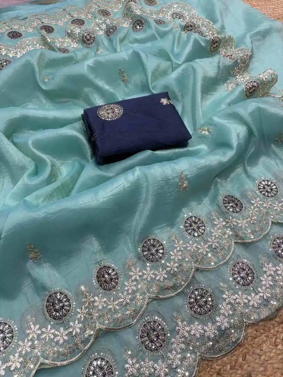 SAREE FABRIC : PURE SOFT TABBY ORGANZA WITH HEAVY EMBROIDERY MULTI TREADS , CODING & SEQUENCE WORK & FANCY CUT WORK BORDER