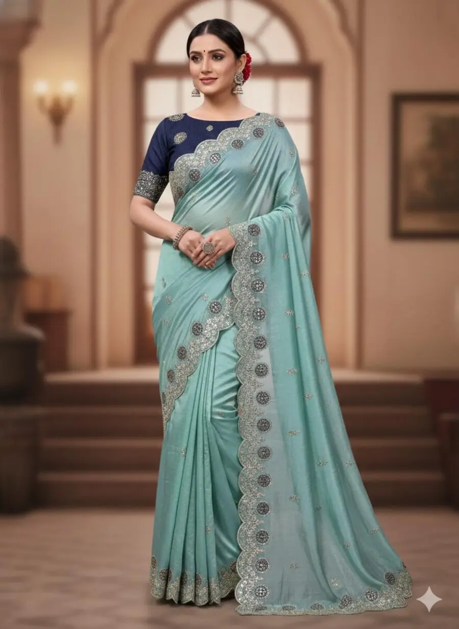 FANCY GOLD CRUSH EMBROIDERY AND MULTI THREAD WITH ARCO CUT WORK BORDER SAREE WITH UNSTITCHED BLOUSE SKY