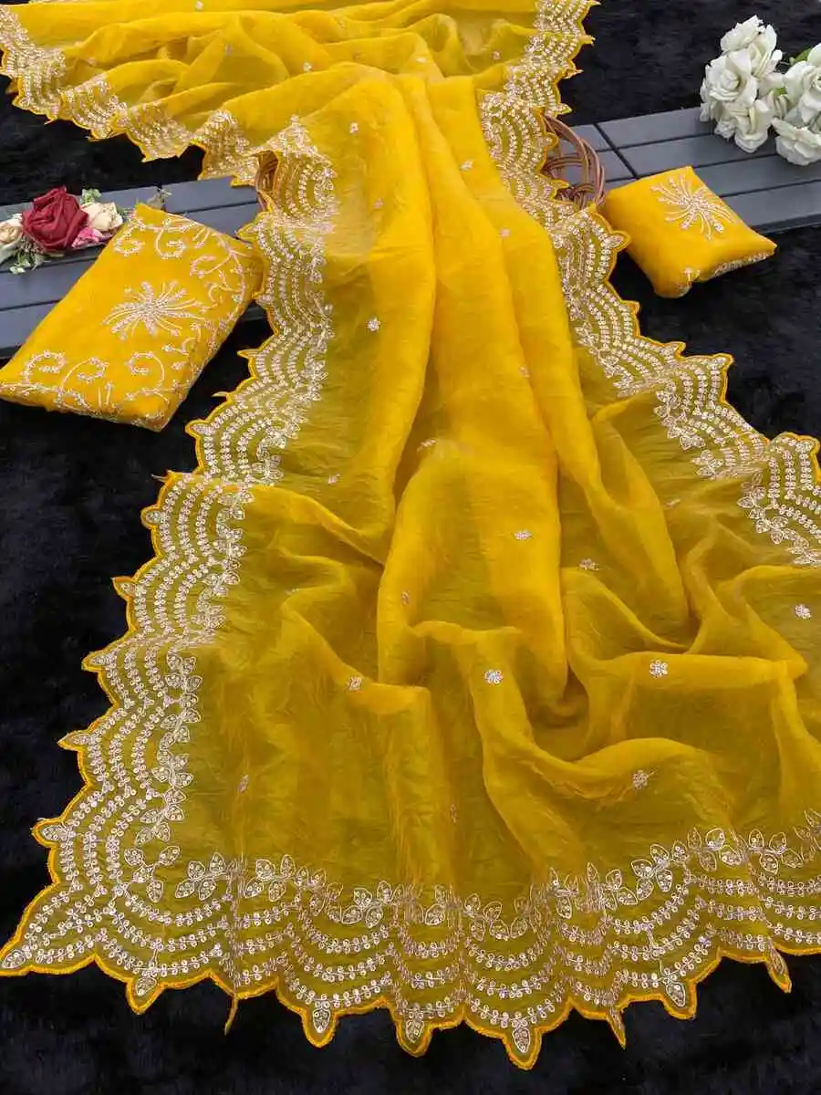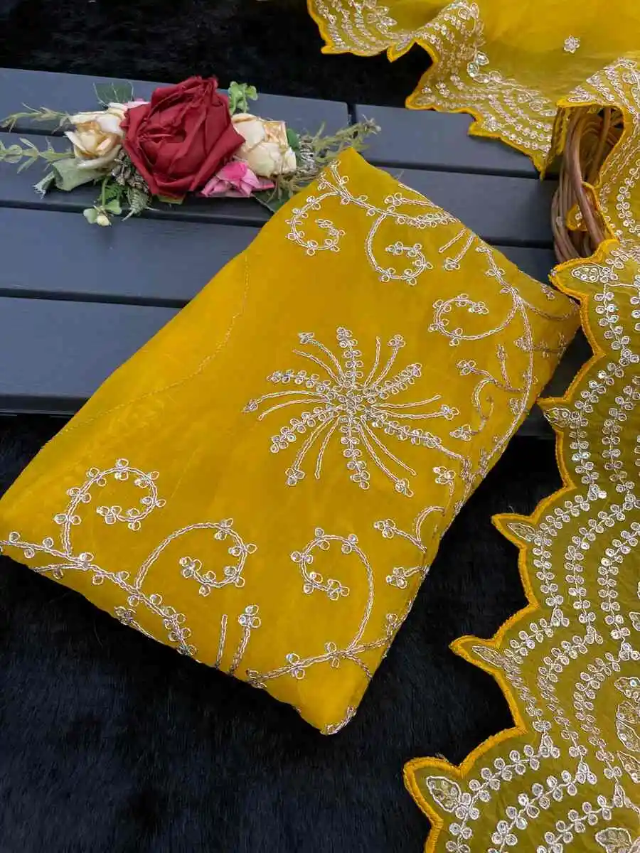 FANCY GOLD CRUSH MULTI THREAD EMBROIDERY WITH SEQUENCE WORK SAREE WITH UNSTITCHED BLOUSE YELLOW