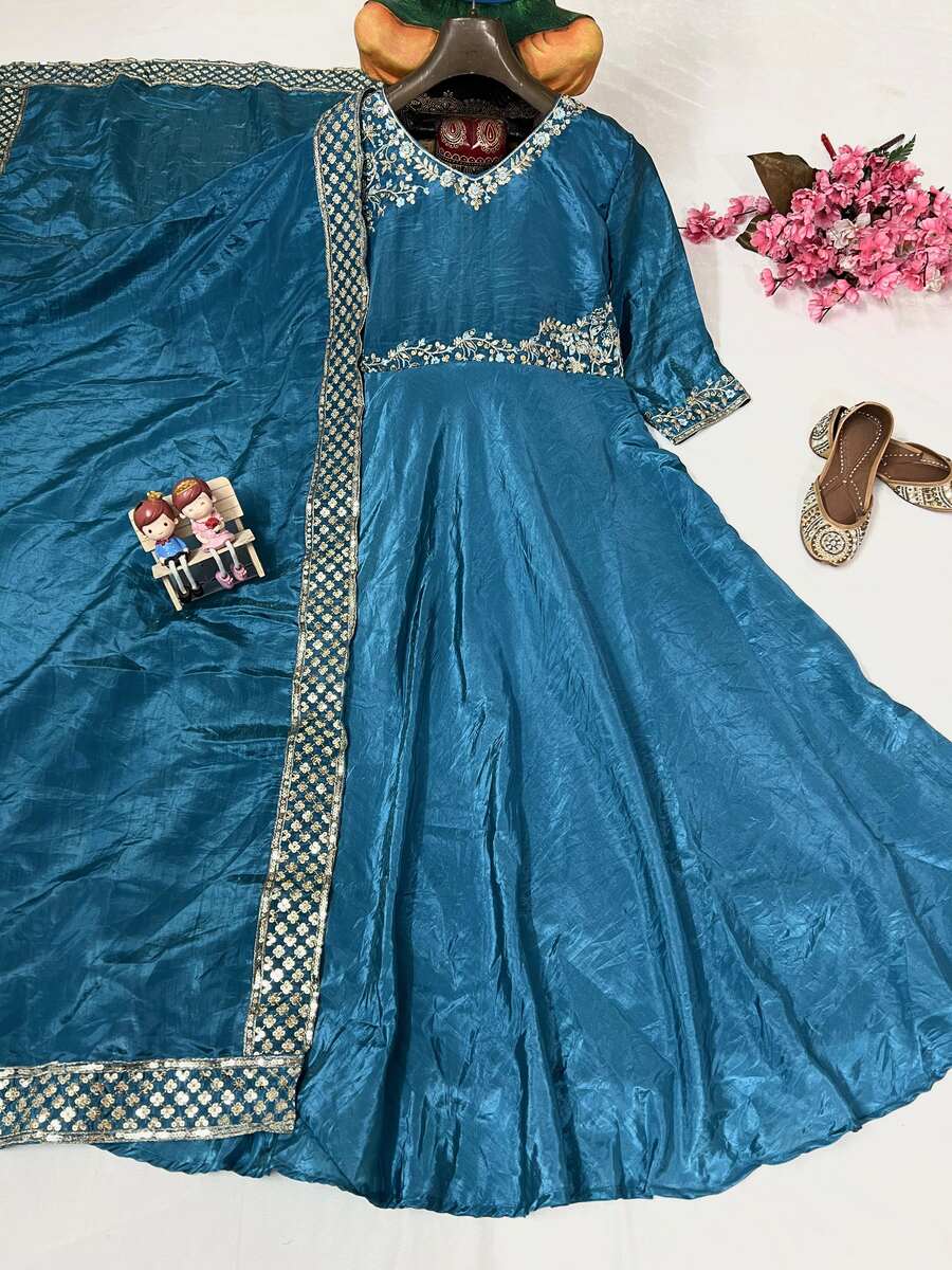 FANCY GOLD CRUSHED SILK THREAD AND SEQUENCE EMBROIDERY WORK GOWN WITH DUPATTA TEAL
