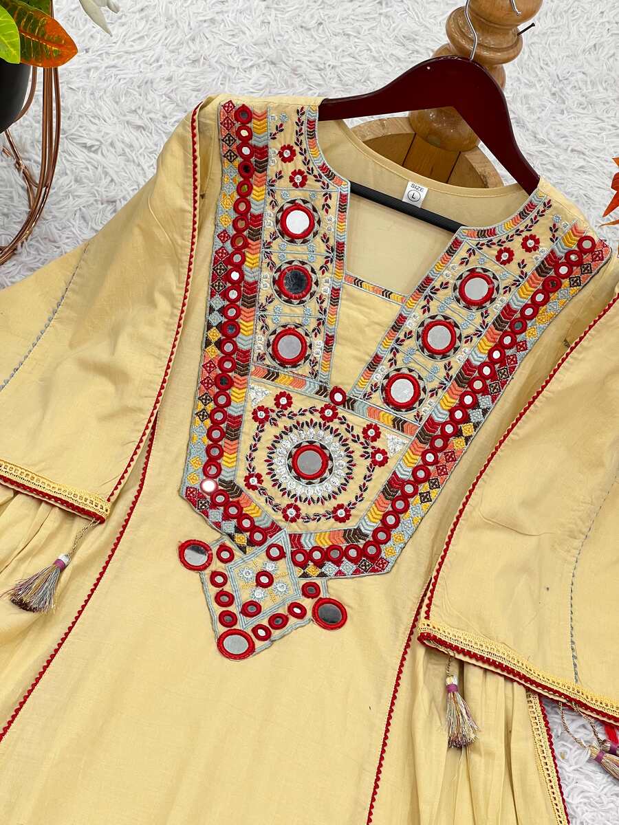 FANCY KHADI COTTON EMBROIDERY SEQUENCE WORK WITH REAL MIRROR WORK KURTI PALAZZO SET CREAM