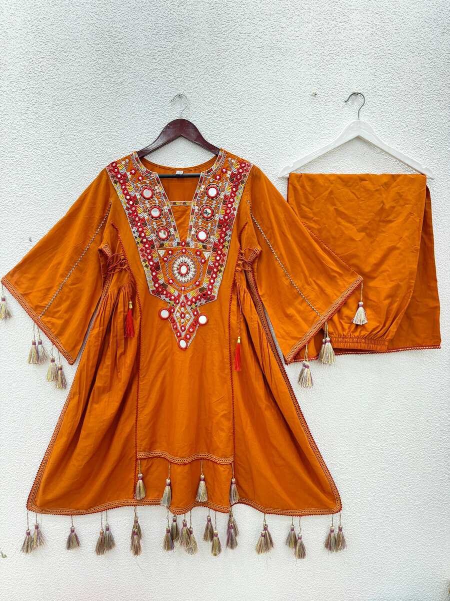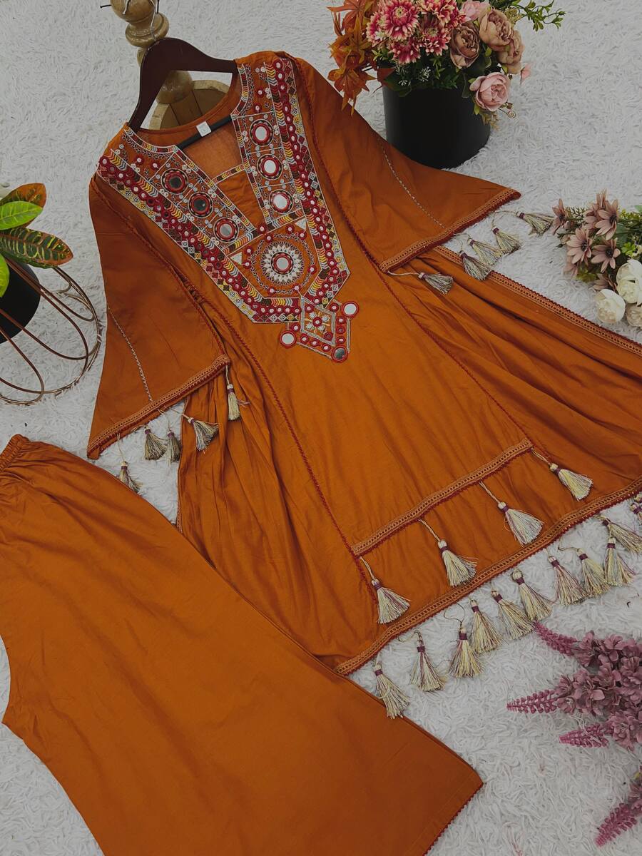 FANCY KHADI COTTON EMBROIDERY SEQUENCE WORK WITH REAL MIRROR WORK KURTI PALAZZO SET MUSTARD