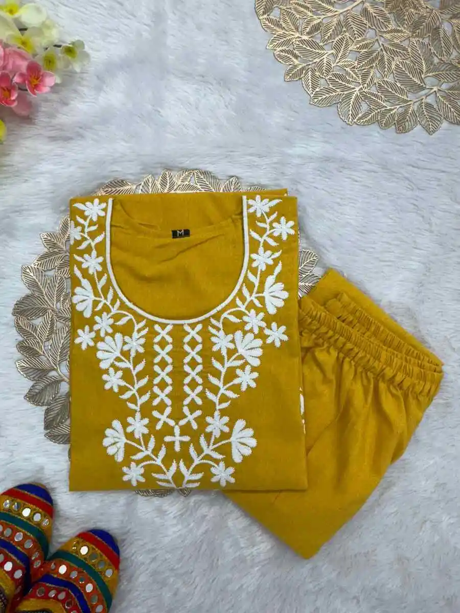 FANCY KHADI COTTON EMBROIDERY WORK TOP BOTTOM SET YELLOW