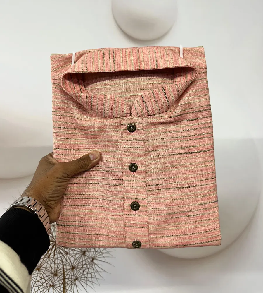 FANCY KHADI LINEN HANDWOVEN WORK MEN’S KURTA PAYJAMA PEACH