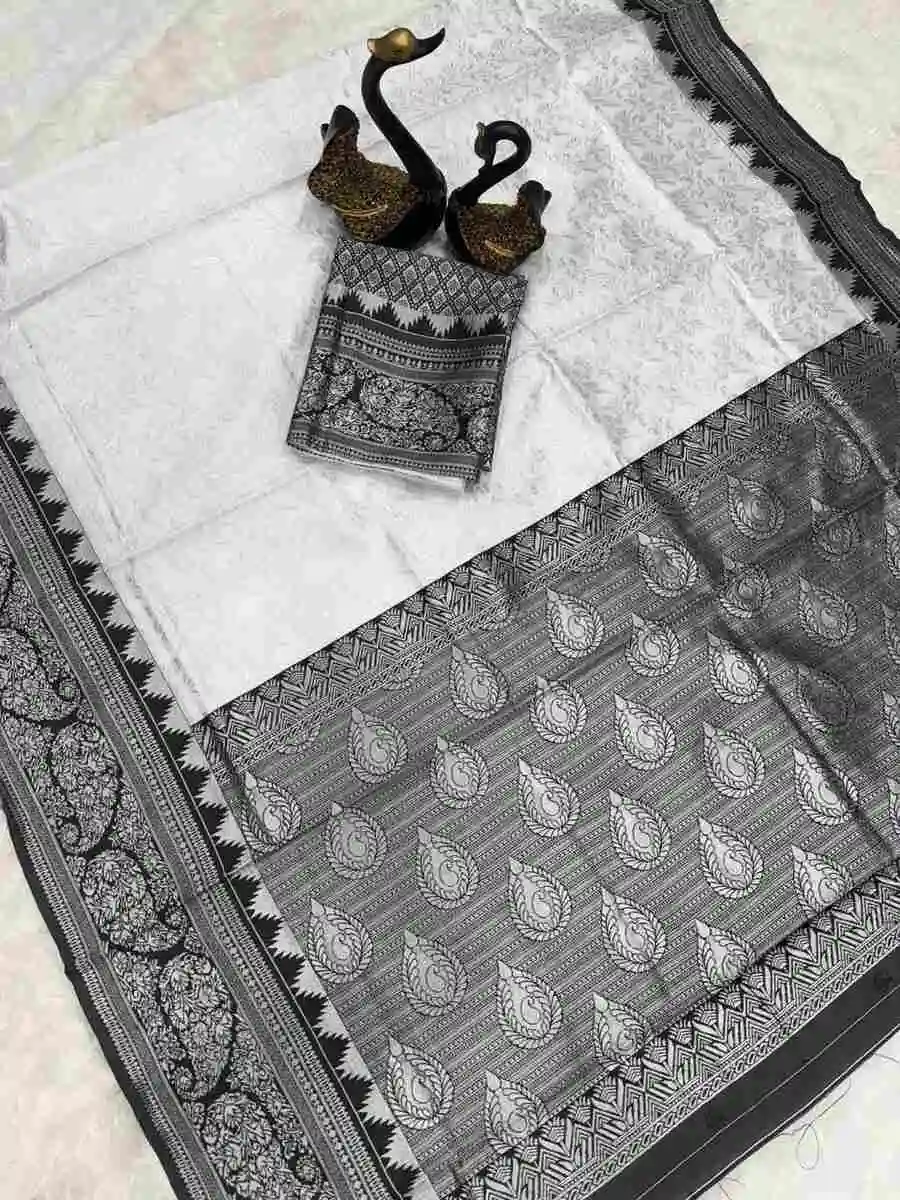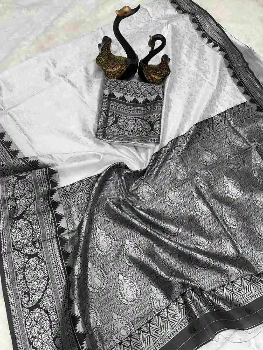 FANCY LICHI SILK BANARASI WEAVING WORK SAREE WITH UNSTITCHED BLOUSE BLACK AND WHITE