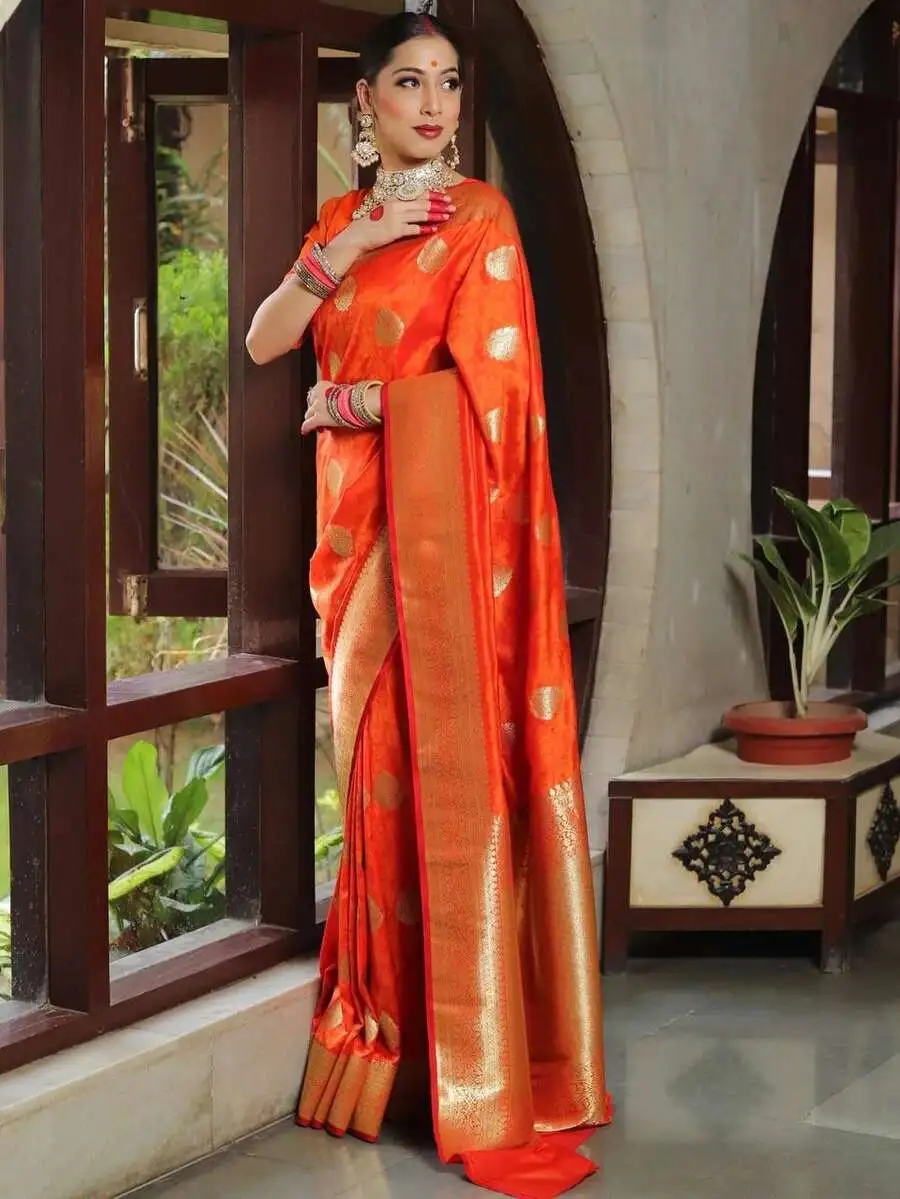 FANCY LICHI SILK BANARASI WEAVING WORK SAREE WITH UNSTITCHED BLOUSE ORANGE