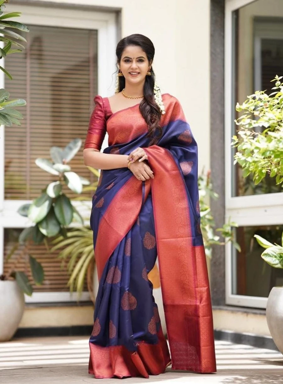 FANCY LICHI SILK RICH PALLU AND JACQUARD BORDER COPPER WORK SAREE WITH UNSTITCHED BLOUSE BLUE