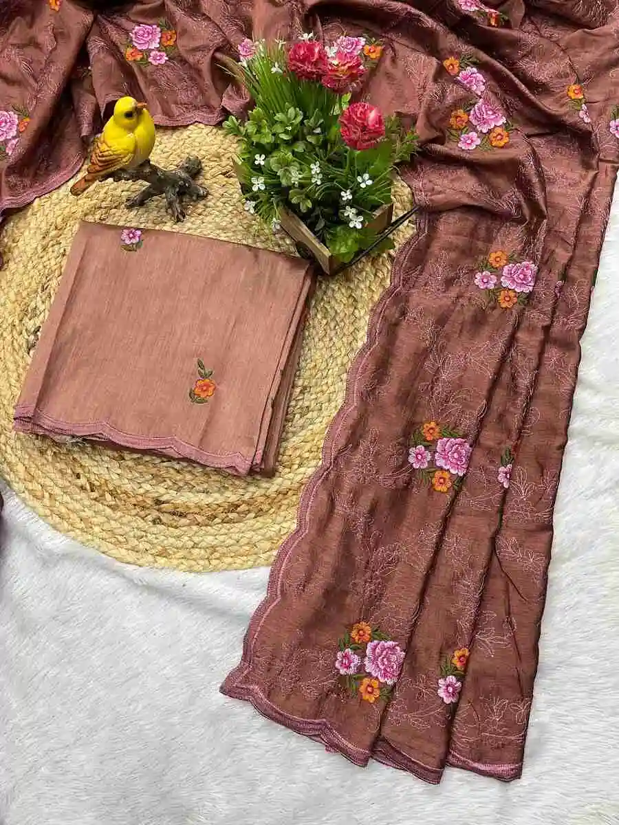 FANCY MANIPURI SILK MULTI THREAD EMBROIDERY WORK WITH CUTWORK SAREE WITH UNSTITCHED BLOUSE CHIKU