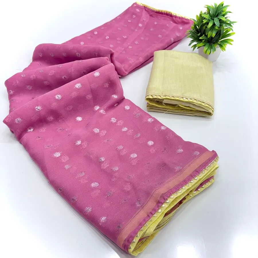 FANCY MOSS BUTTI SILK ZARI BUTTI WITH CONTRAST PALLU EMBROIDERY THREAD PITTA WORK SAREE WITH UNSTITCHED BLOUSE PINK