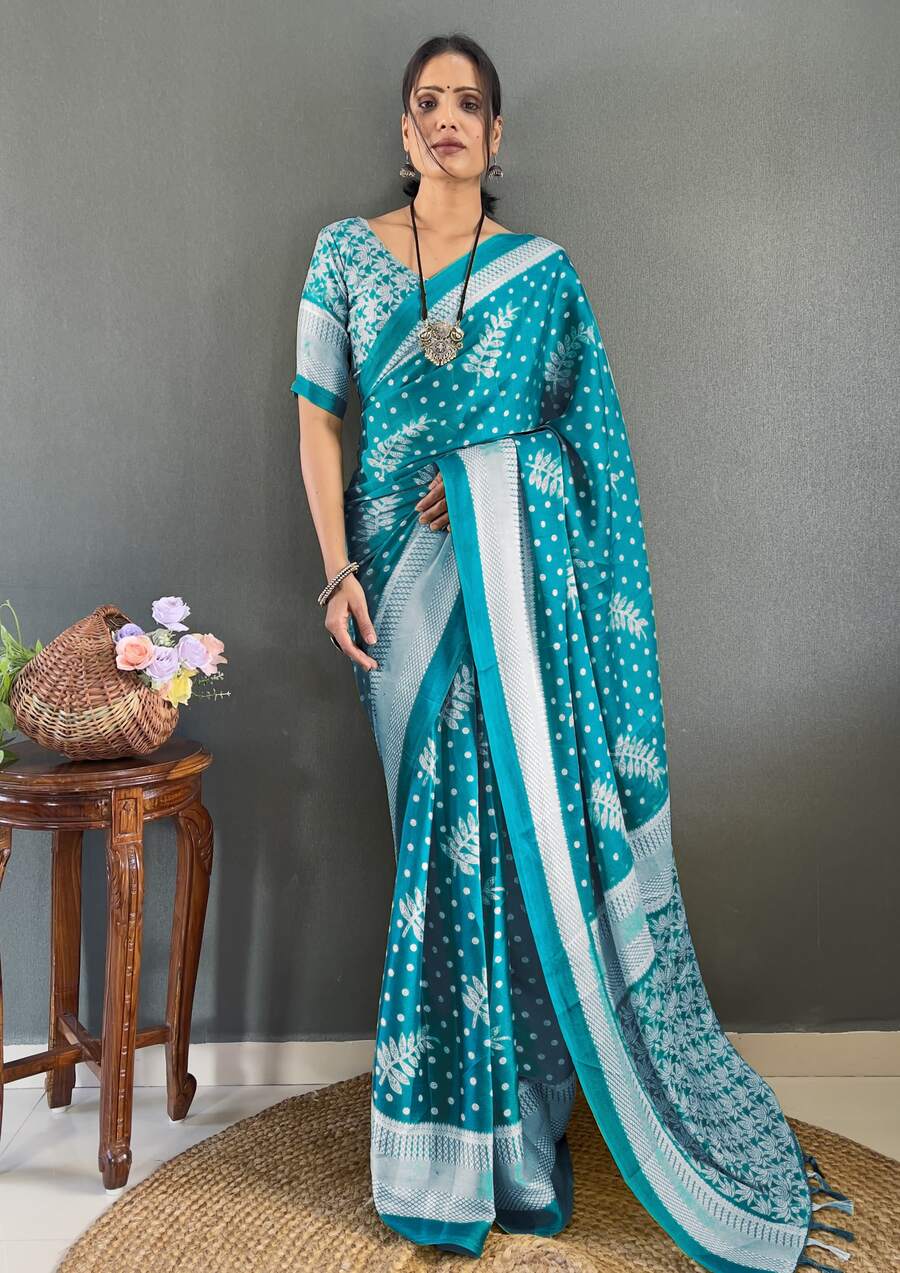 FANCY MOSS SILK PRINT WORK READY TO WEAR SAREE WITH UNSTITCHED BLOUSE RAMA