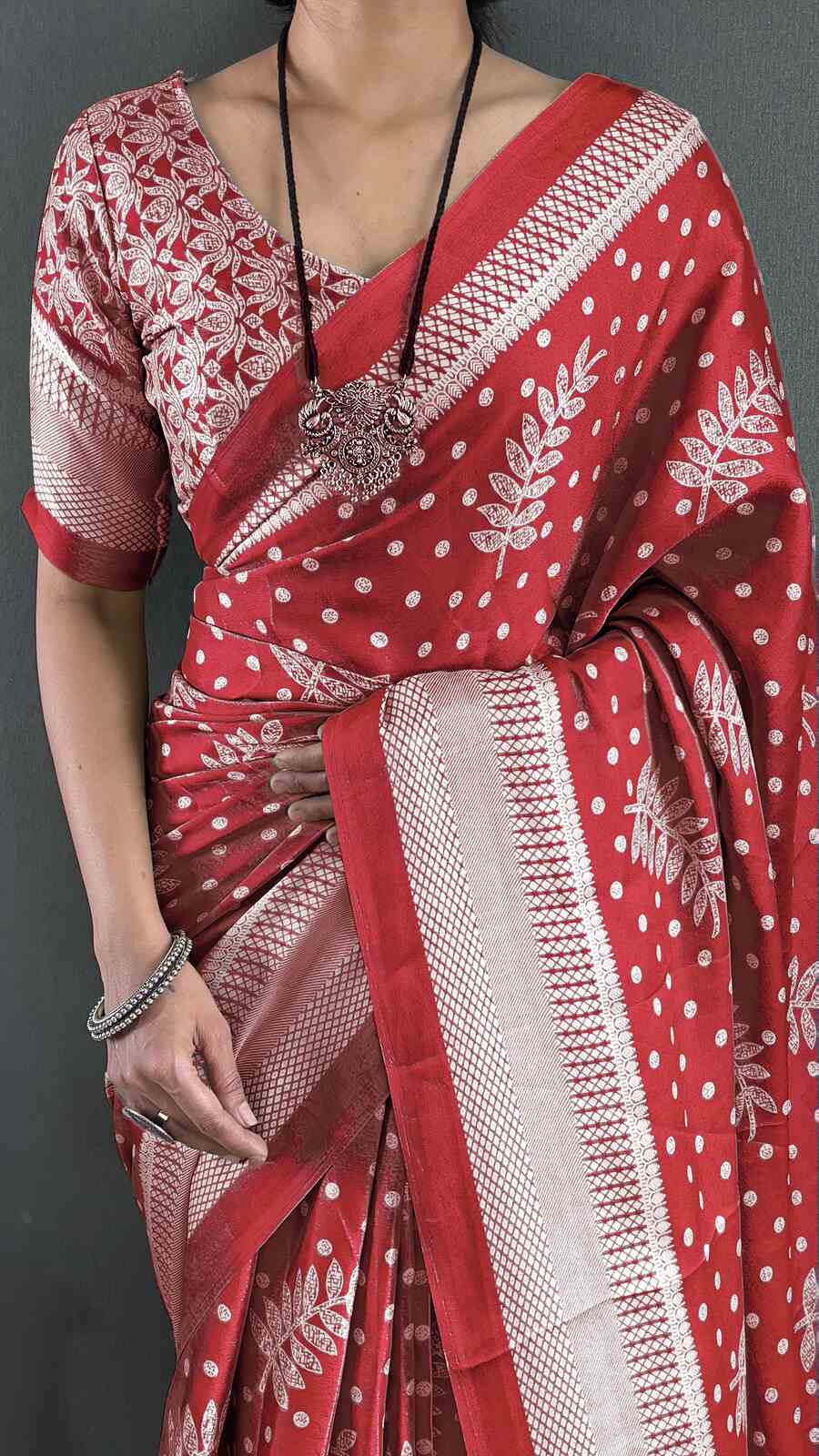 FANCY MOSS SILK PRINT WORK READY TO WEAR SAREE WITH UNSTITCHED BLOUSE RED