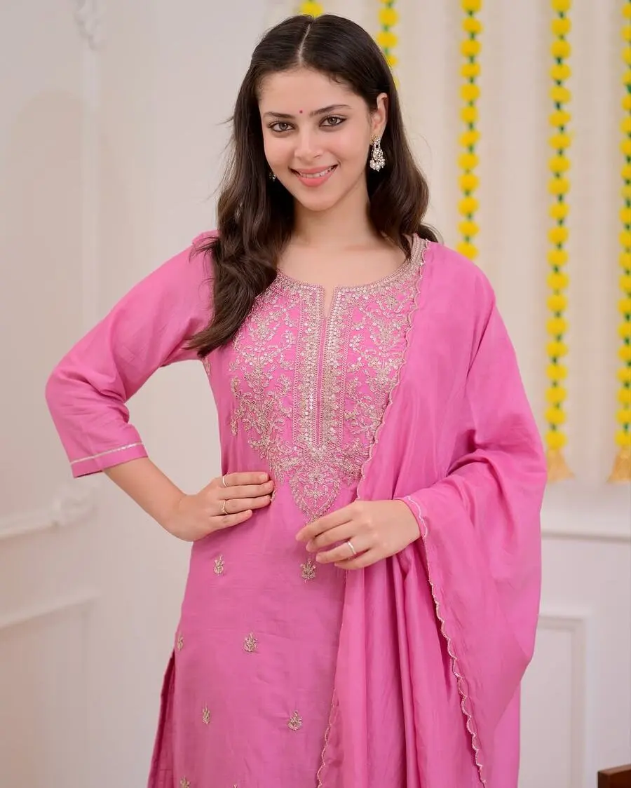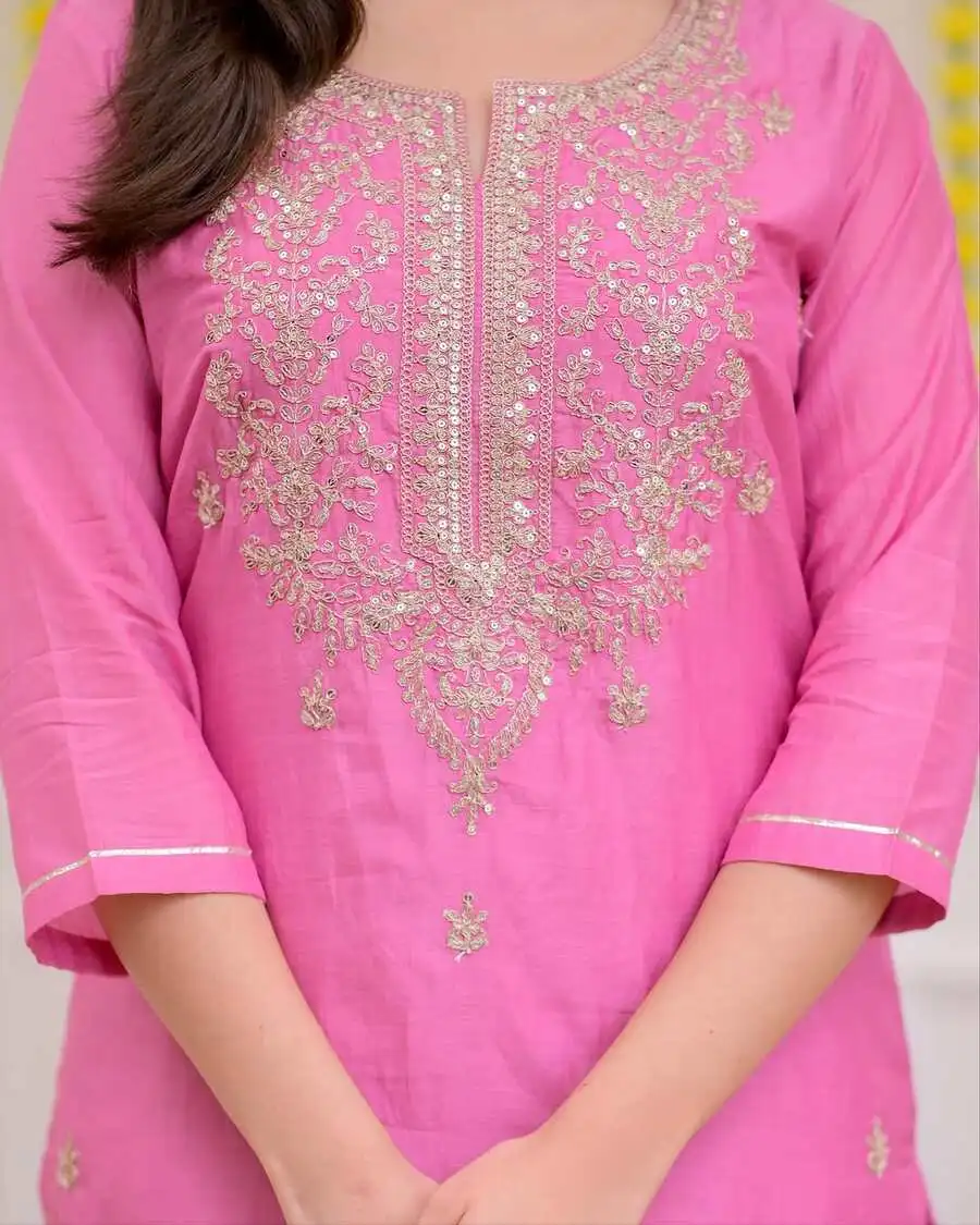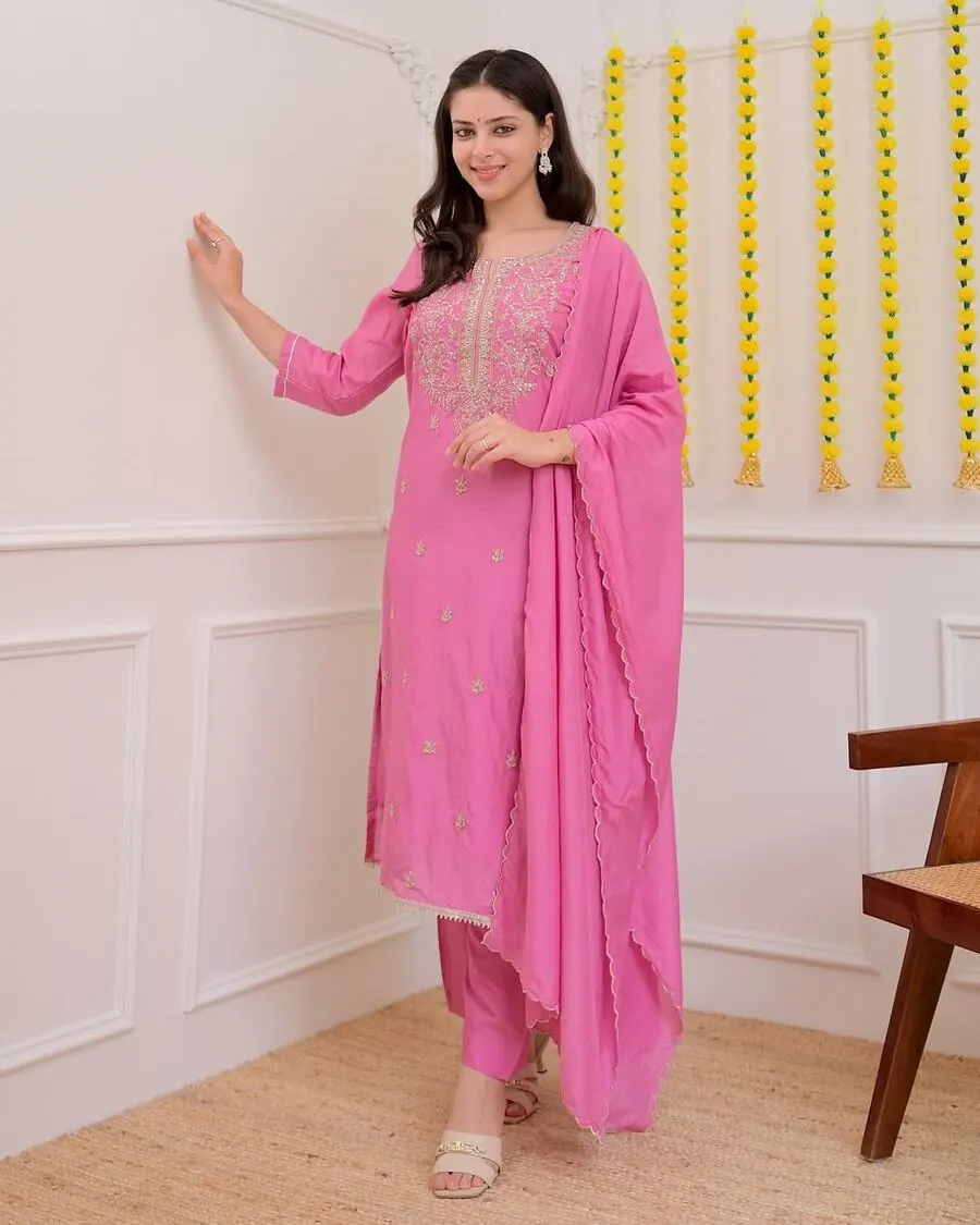 FANCY MUL CHANDERI CODING AND SEQUENCE AND LACE WORK TOP BOTTOM WITH DUPATTA PINK