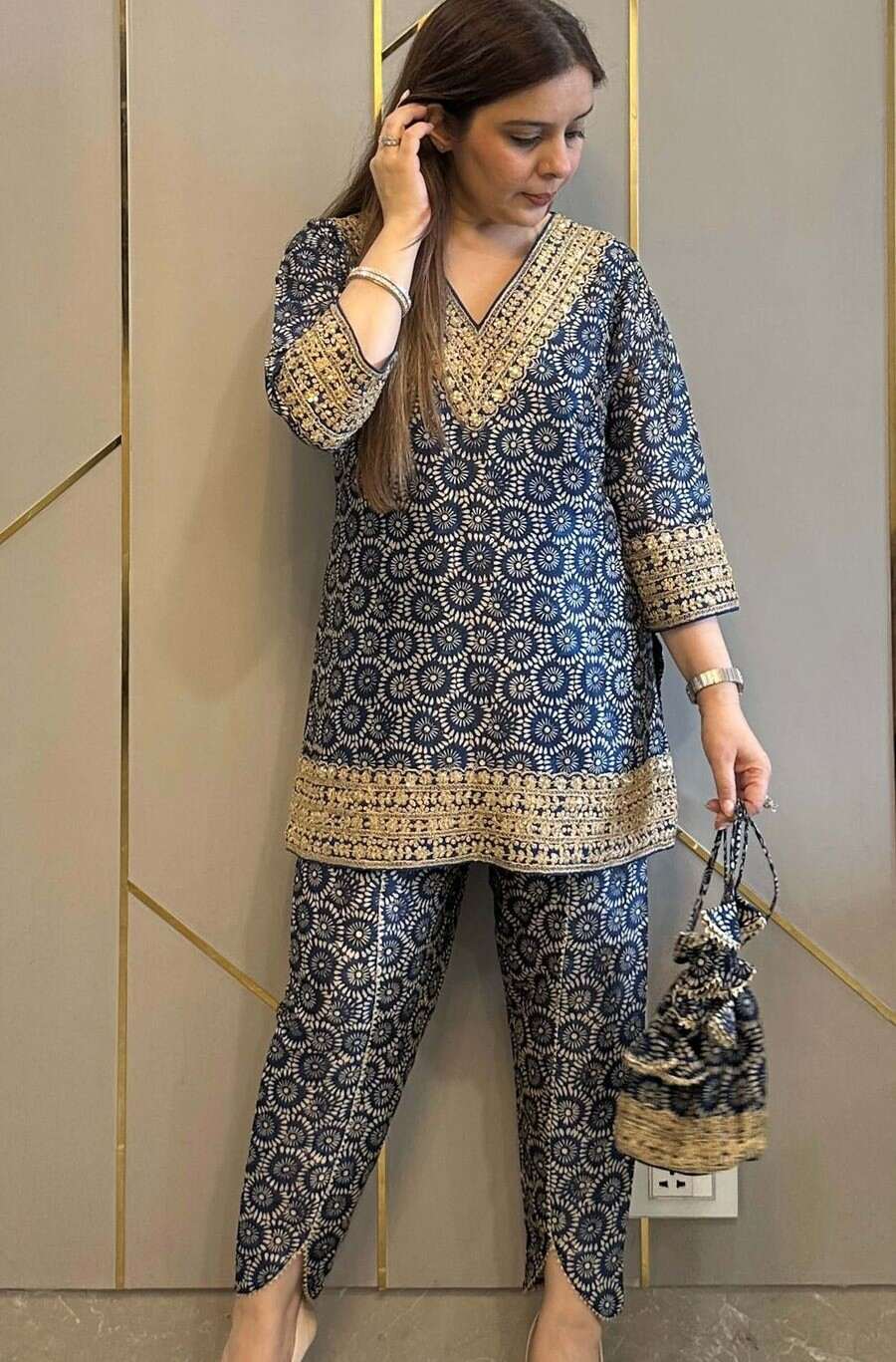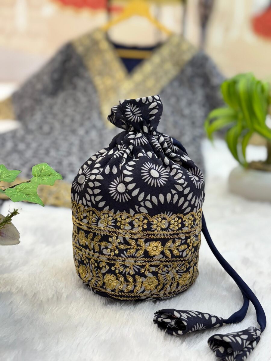 FANCY MUL COTTON EMBROIDERY WORK ON NECK & DAMAN PATTA WORK CO-ORD SET WITH POTLI PURSE NAVY BLUE