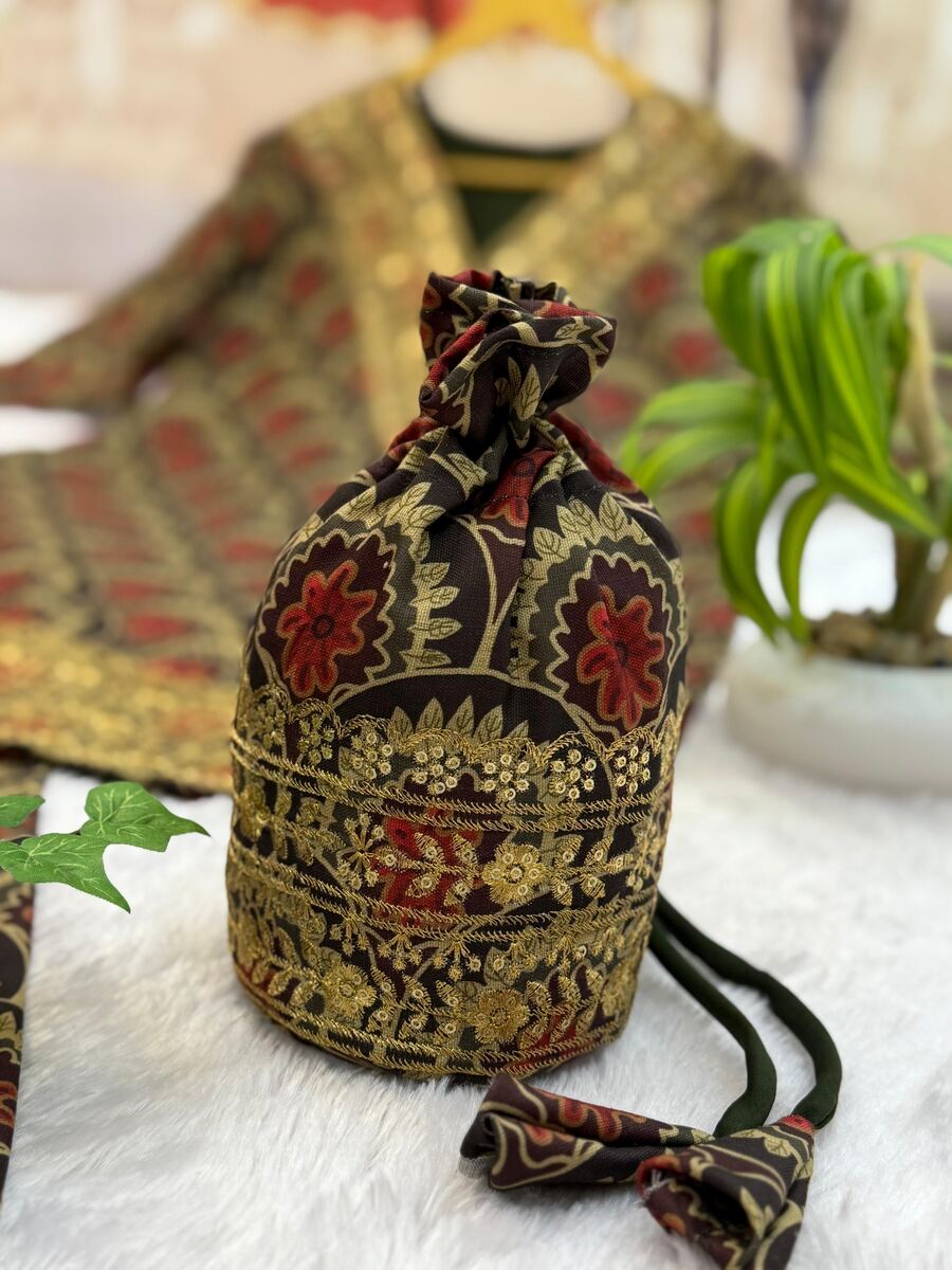 FANCY MUL COTTON EMBROIDERY WORK ON NECK & DAMAN PATTA WORK CO-ORD SET WITH POTLI PURSE BROWN