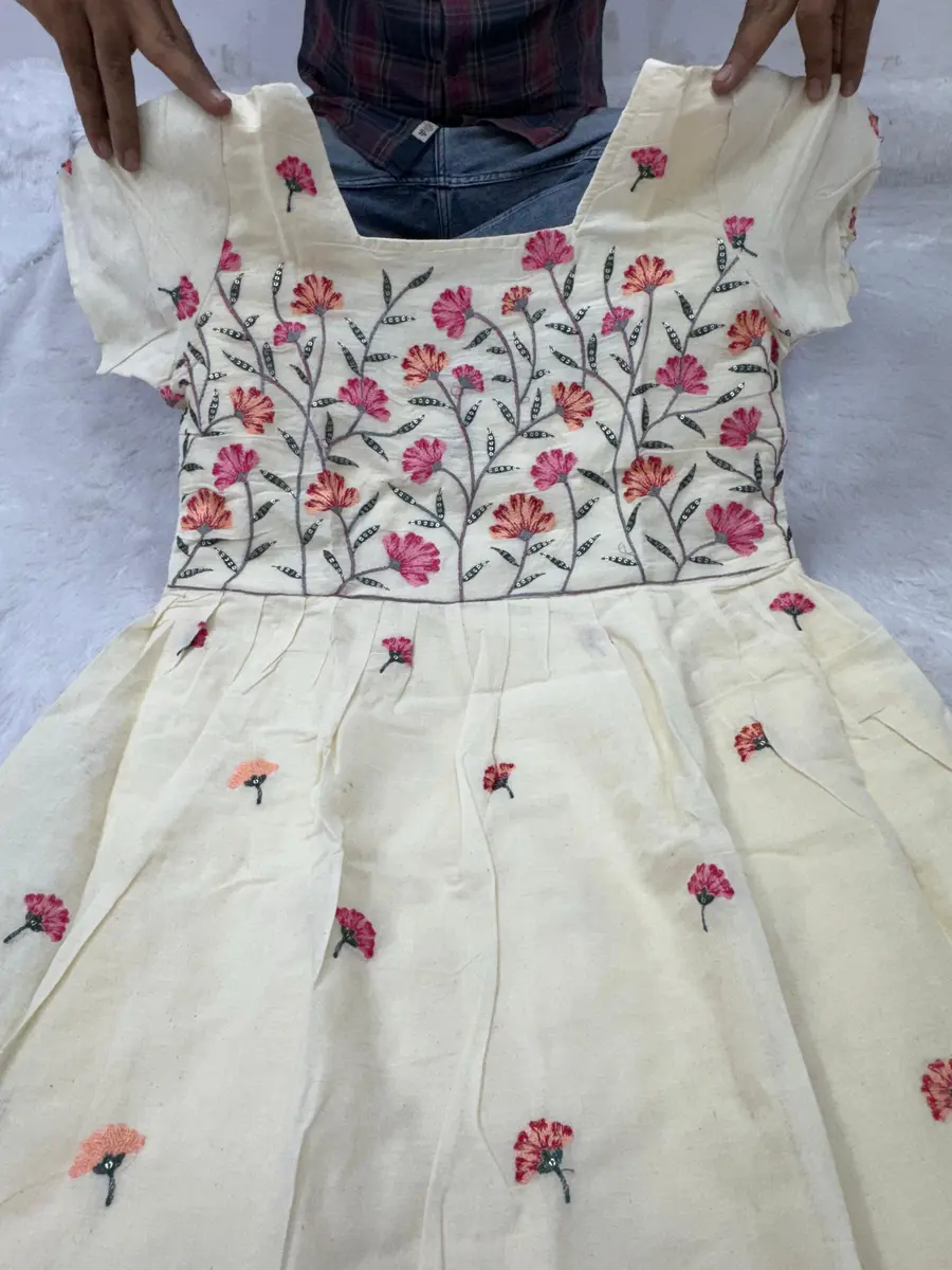 FANCY MUL COTTON EMBROIDERY WORK ONE PIECE DRESS OFF WHITE AND PINK