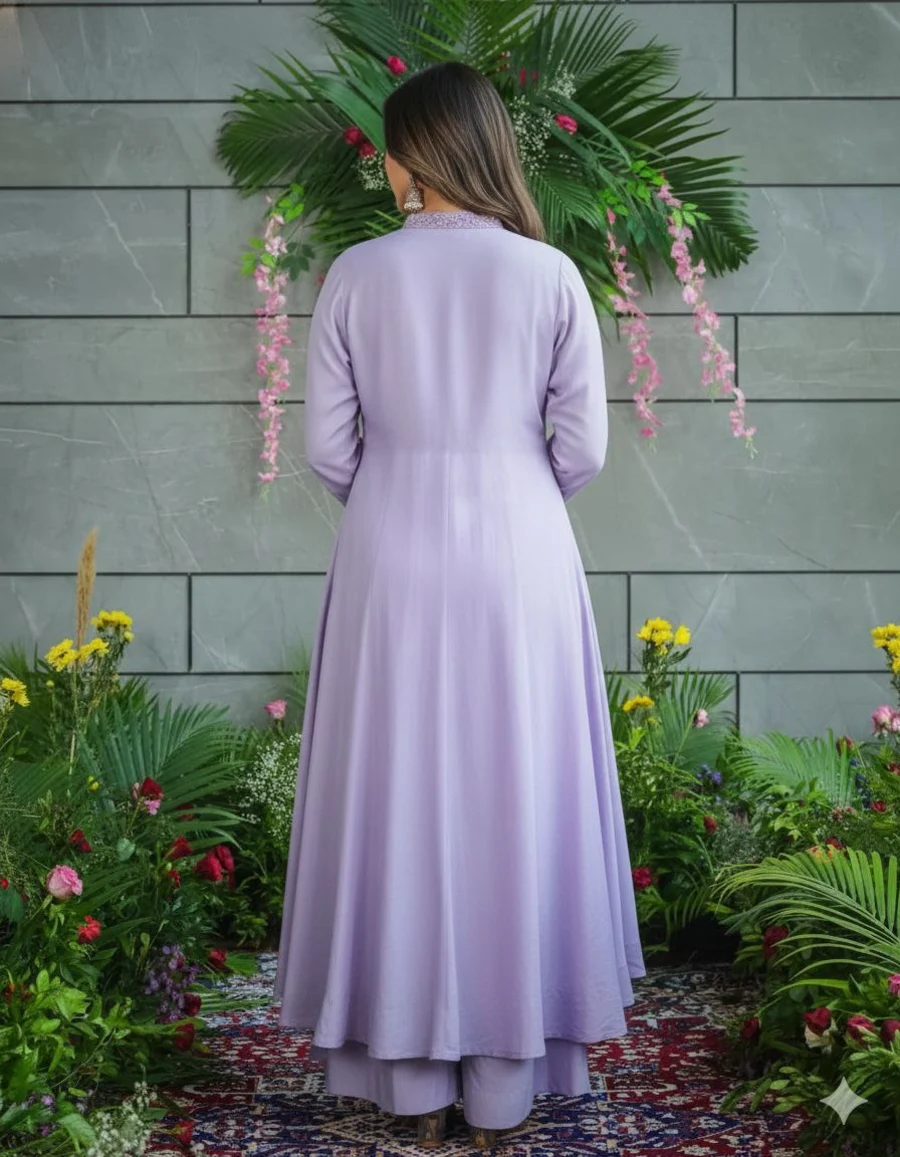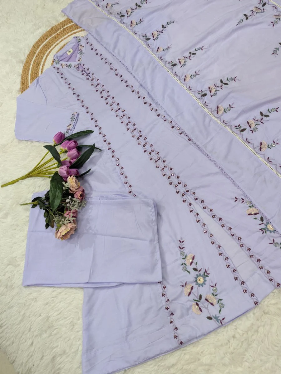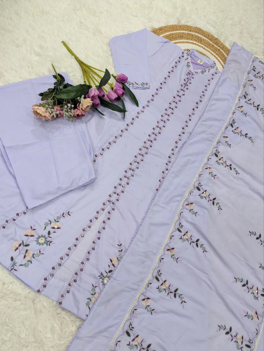 FANCY MUSLIN COTTON EMBROIDERY WORK TOP BOTTOM WITH DUPATTA LAVENDER