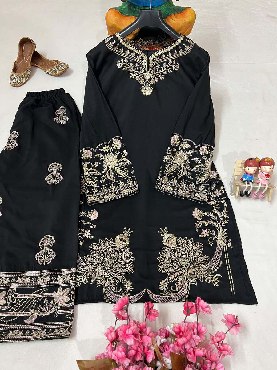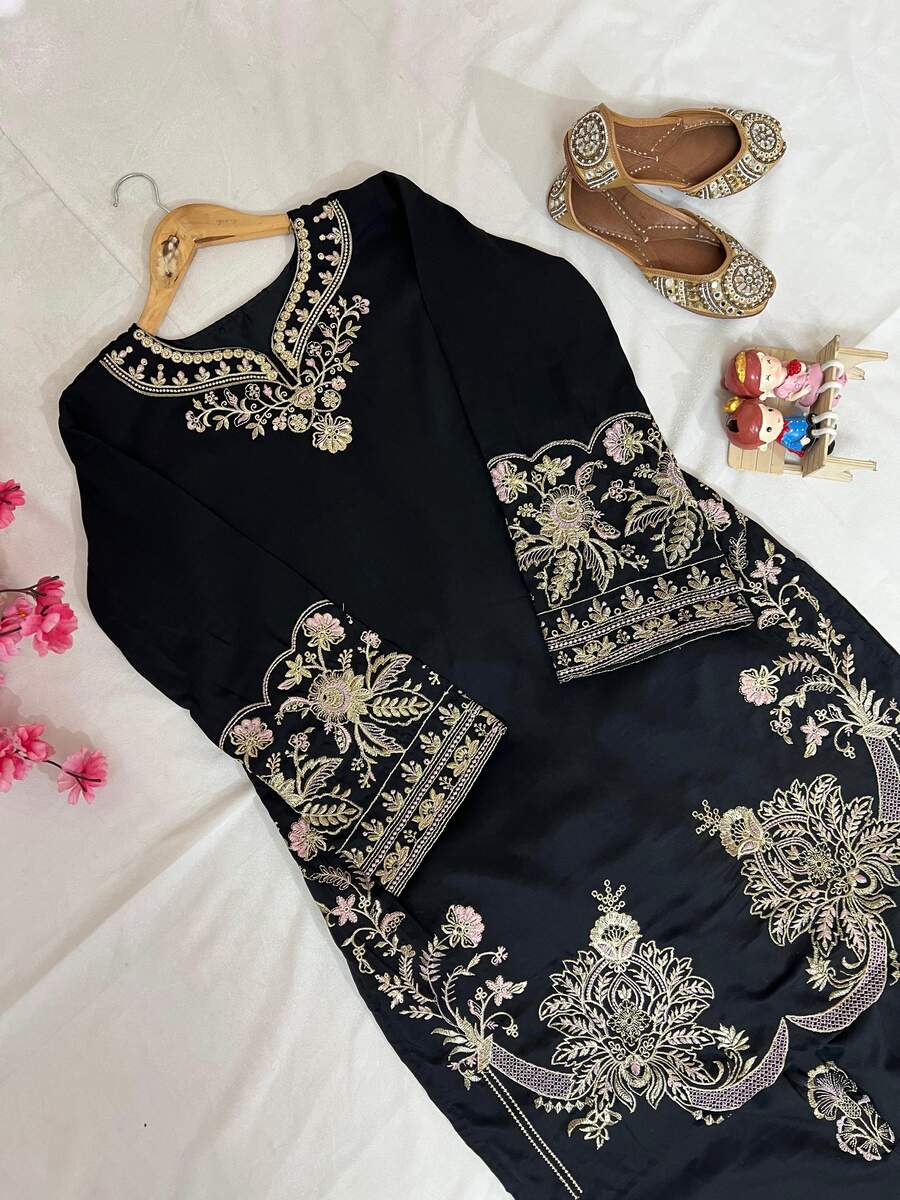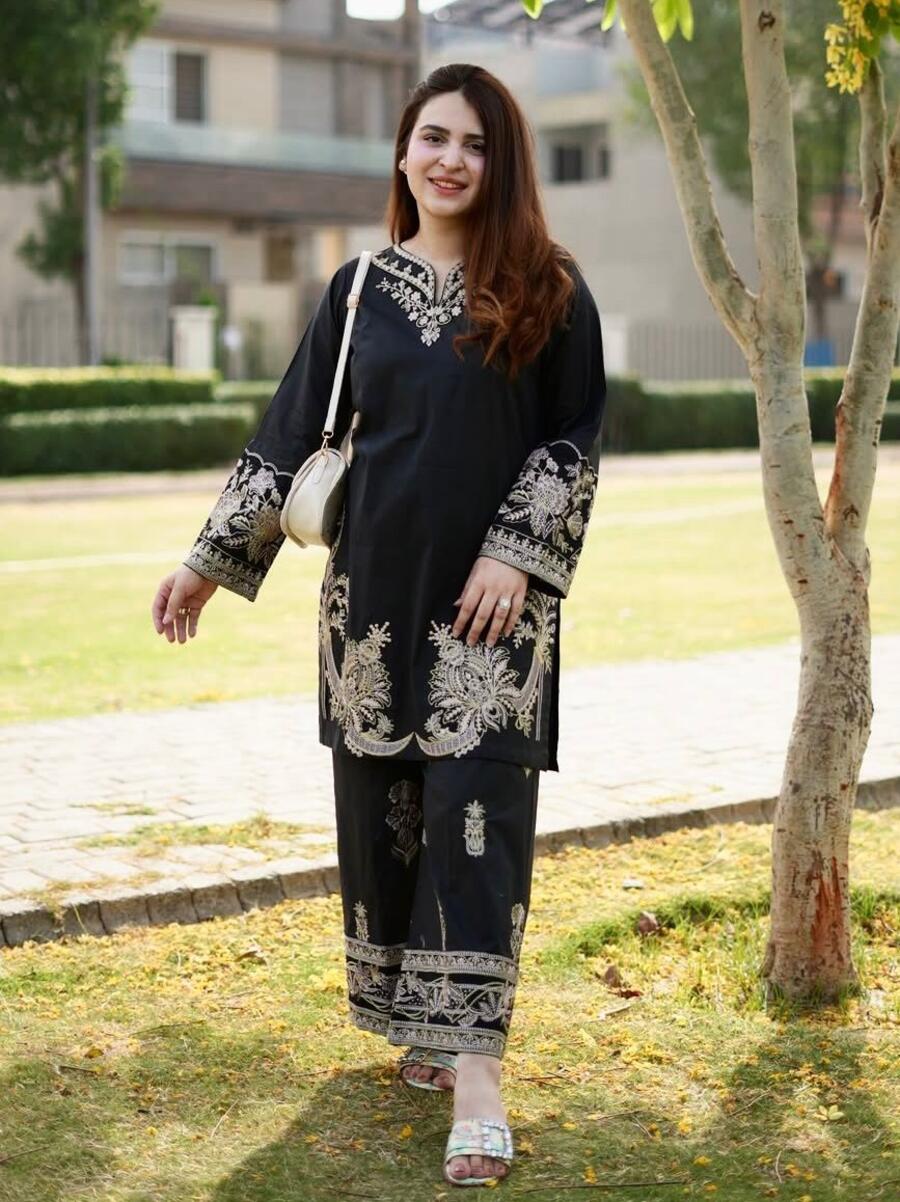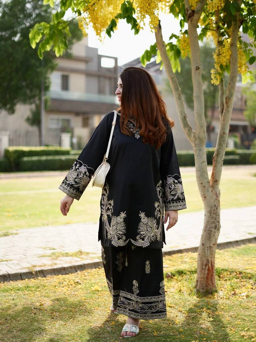 FANCY MUSLIN COTTON THREAD EMBROIDERY WORK CO-ORD SET BLACK