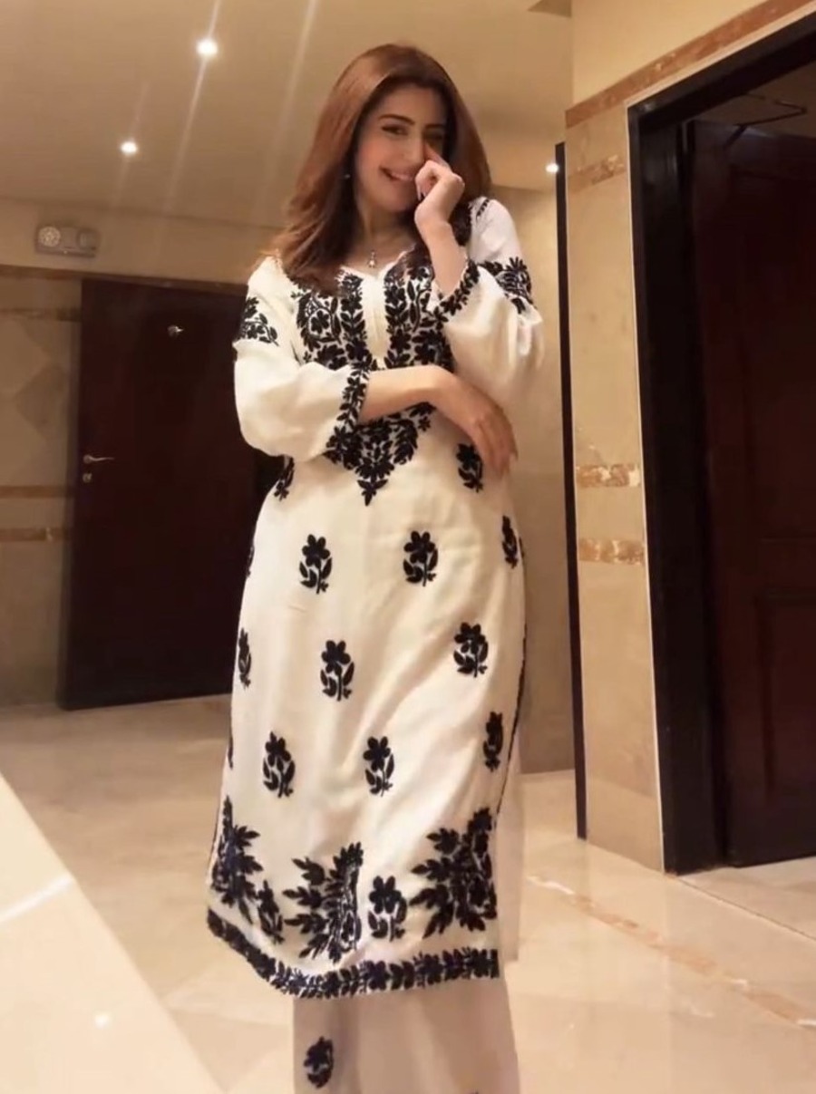 FANCY MUSLIN EMBROIDERY WORK KURTI PALAZZO SET WHITE