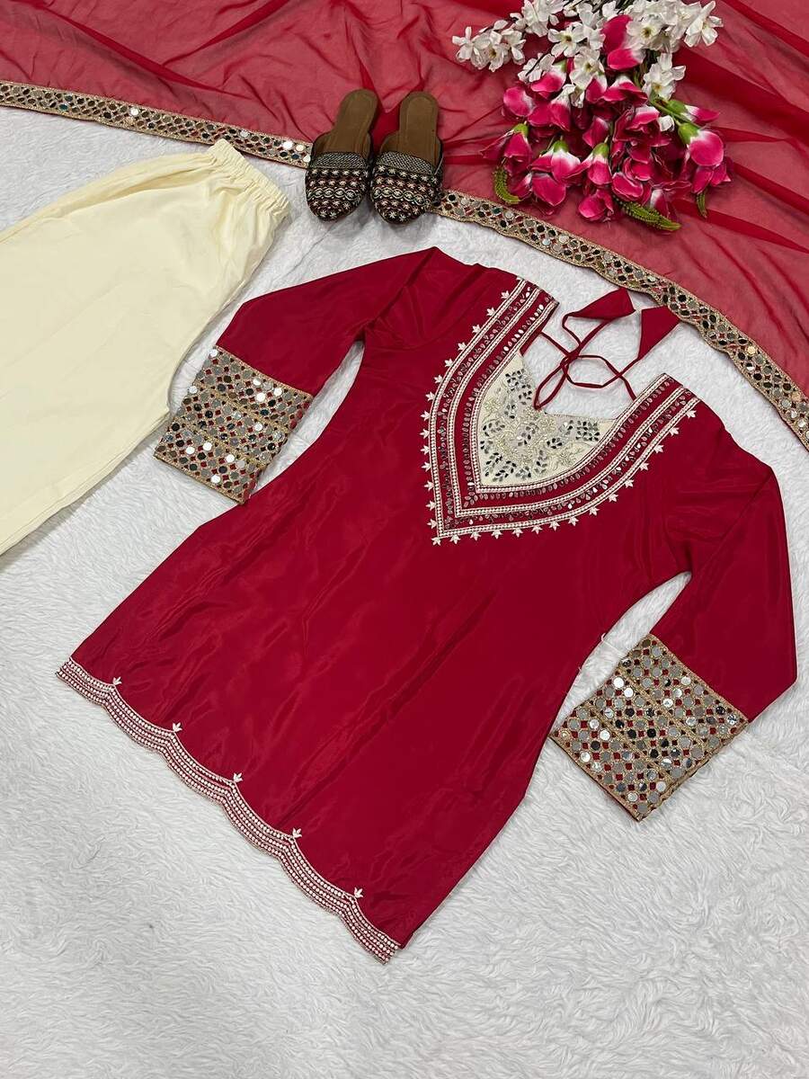 FANCY NATURAL CREPE EMBROIDERY WITH ORIGINAL HAND MIRROR WORK TOP PALAZZO WITH DUPATTA RANI