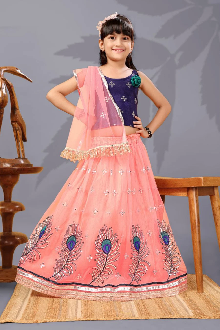 FANCY NET SEQUENCE EMBROIDERY WORK KID’S LEHENGA CHOLI WITH DUPATTA PEACH