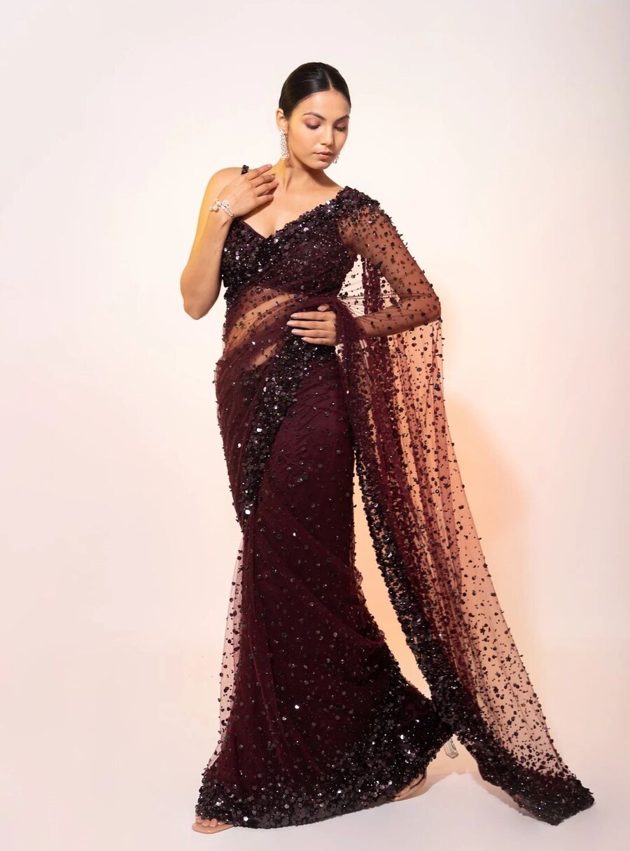 FANCY NET WITH HOLOGRAM SEQUENCE & THREAD WORK SAREE WITH UNSTITCHED BLOUSE MAROON