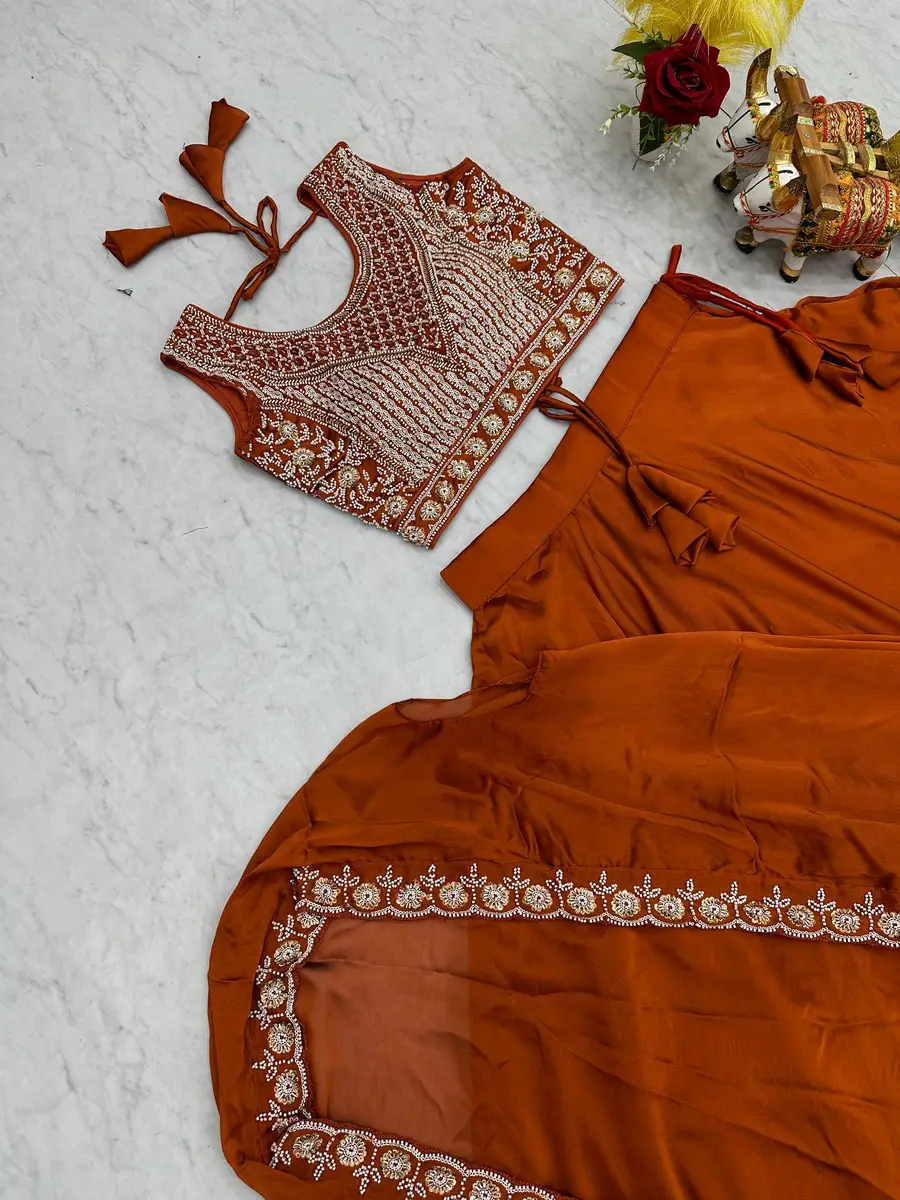 FANCY RANGOLI SILK EMBROIDERY MOTI BEADS & SEQUENCE WORK LEHENGA CHOLI WITH SHRUG STYLE DUPATTA ORANGE