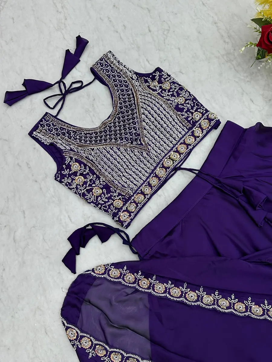 FANCY RANGOLI SILK EMBROIDERY MOTI BEADS & SEQUENCE WORK LEHENGA CHOLI WITH SHRUG STYLE DUPATTA PURPLE
