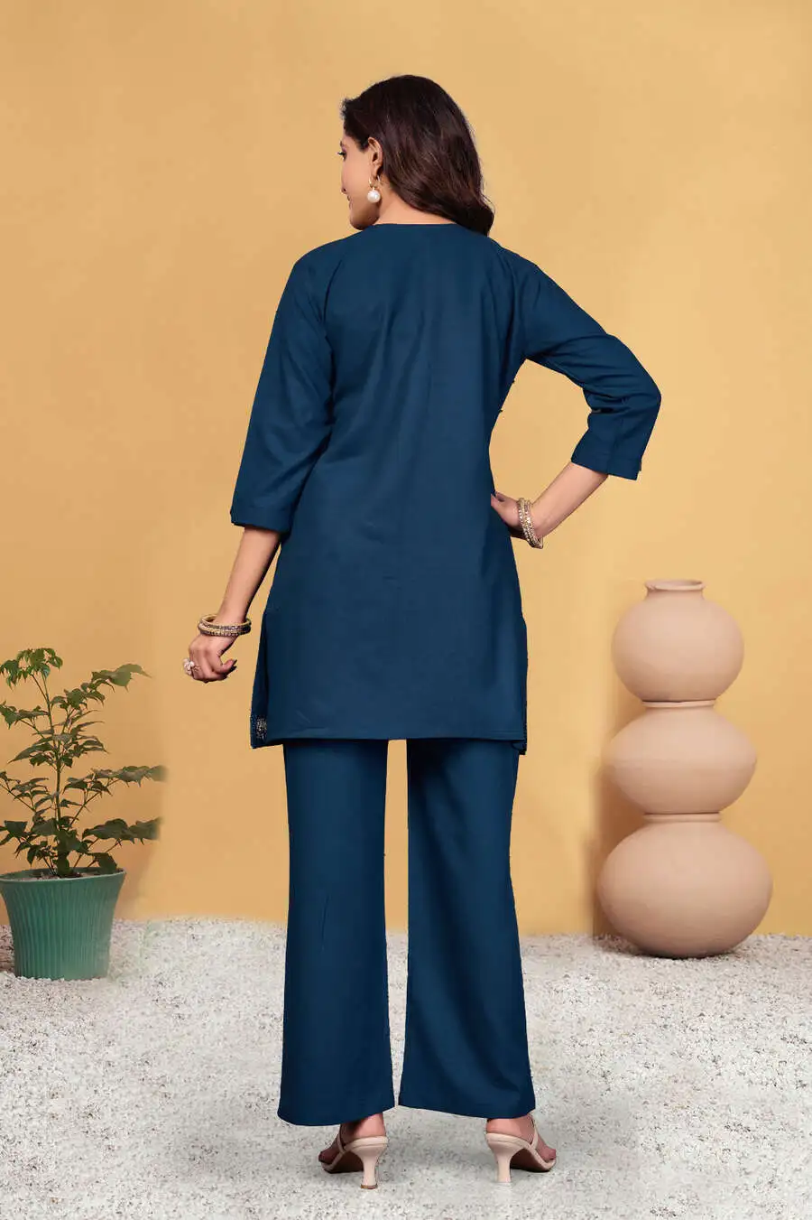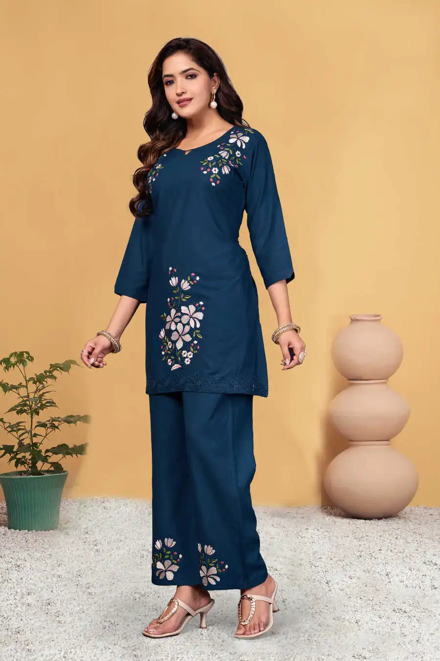 FANCY RAYON MULTI EMBROIDERY THREAD WORK CO-ORD SET BLUE