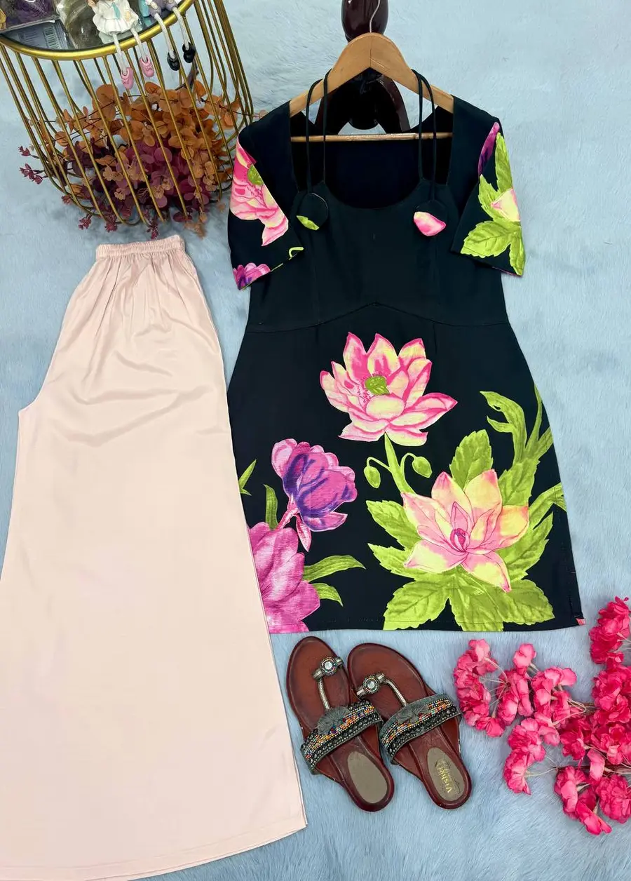FANCY ROMAN SILK DIGITAL PRINT WORK KURTI PALAZZO SET BLACK