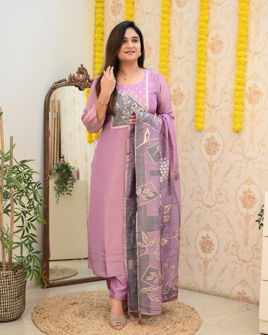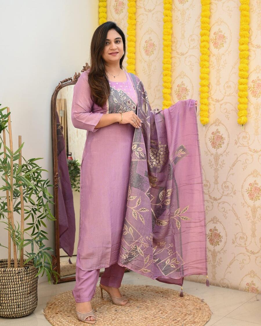 FANCY ROMAN SILK DIGITAL PRINTED WORK TOP BOTTOM WITH DUPATTA LAVENDER