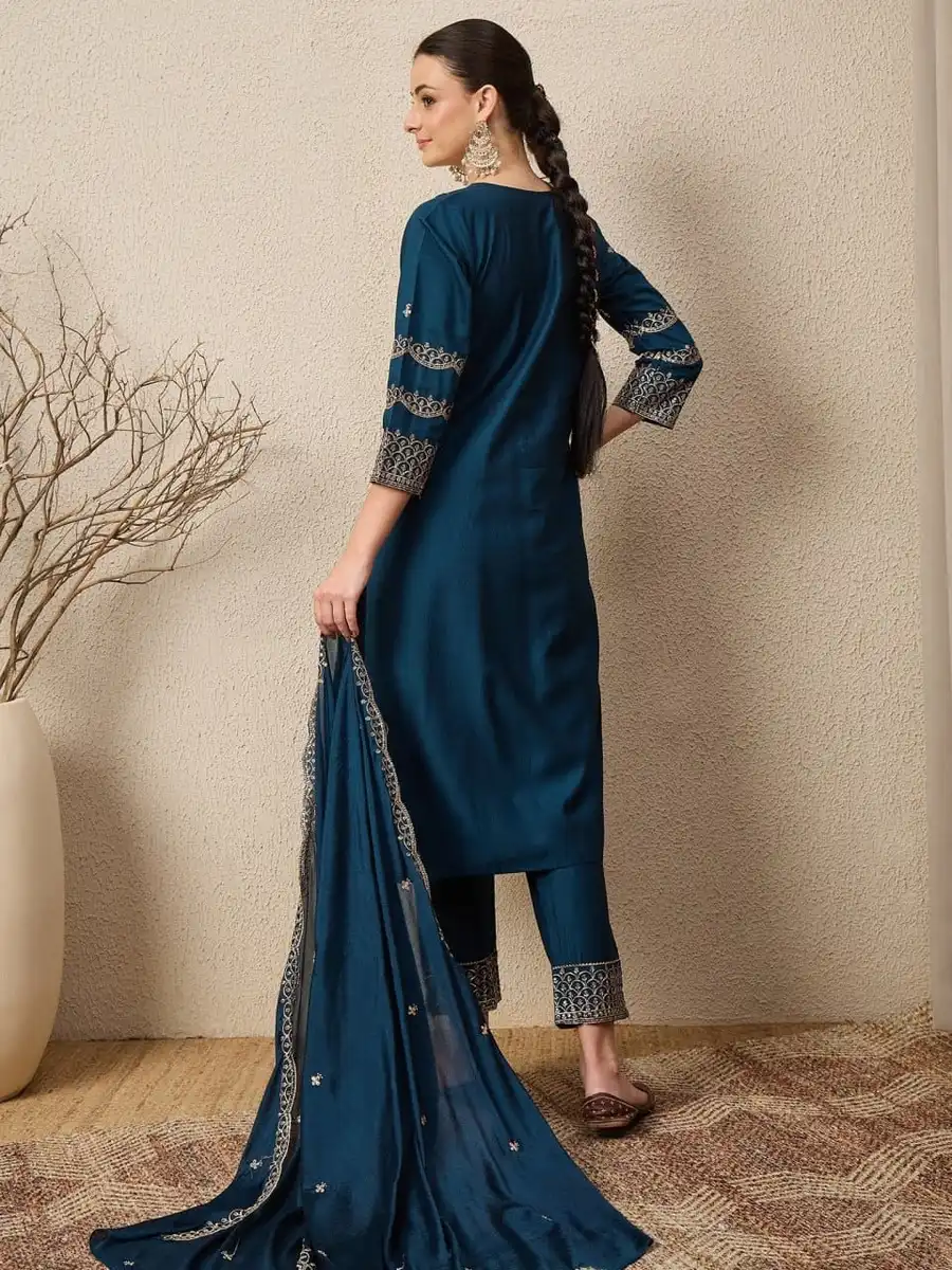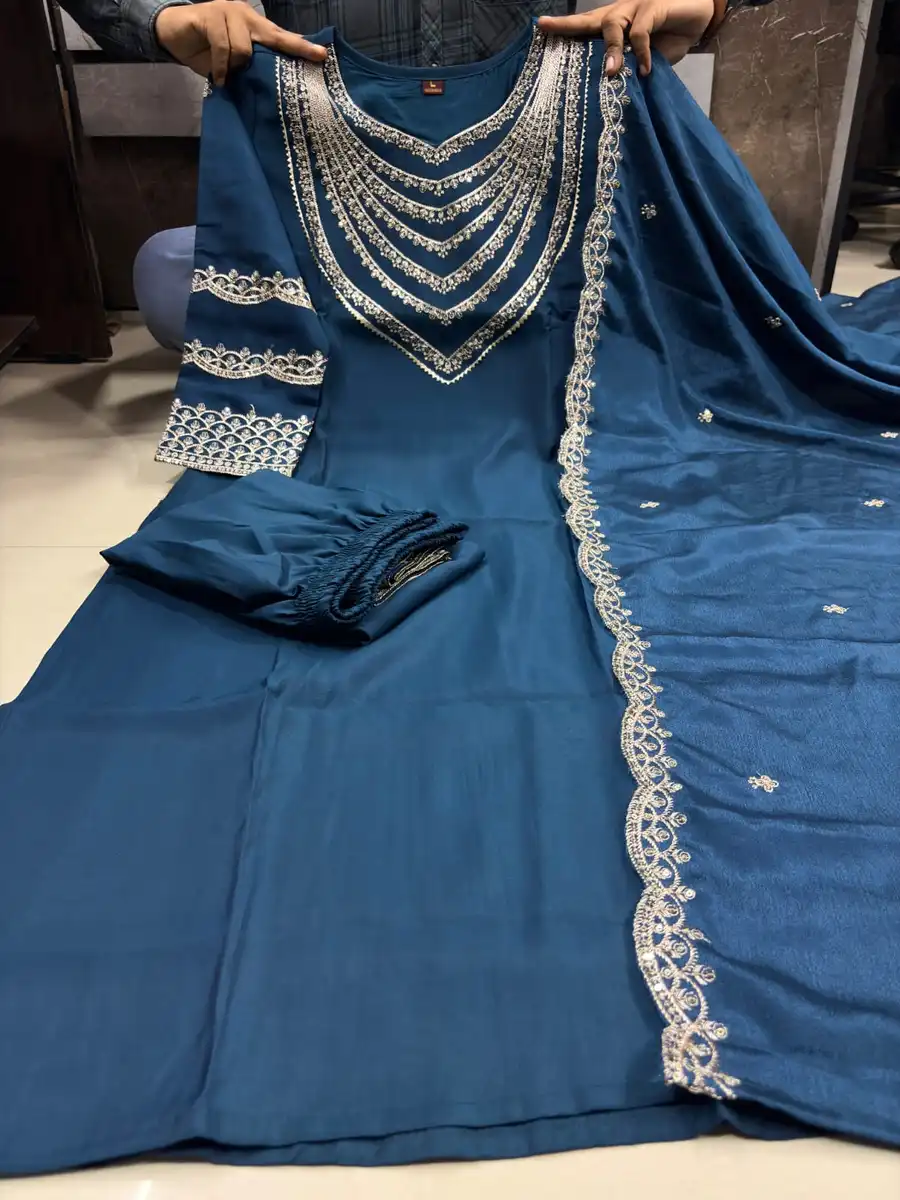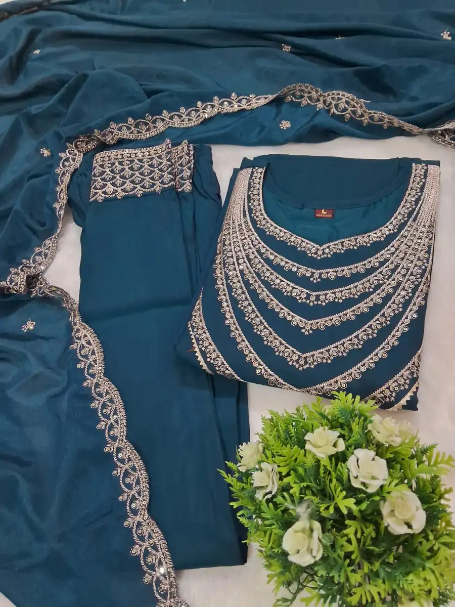 FANCY ROMAN SILK EMBROIDERY SEQUENCE WORK TOP BOTTOM WITH DUPATTA TEAL