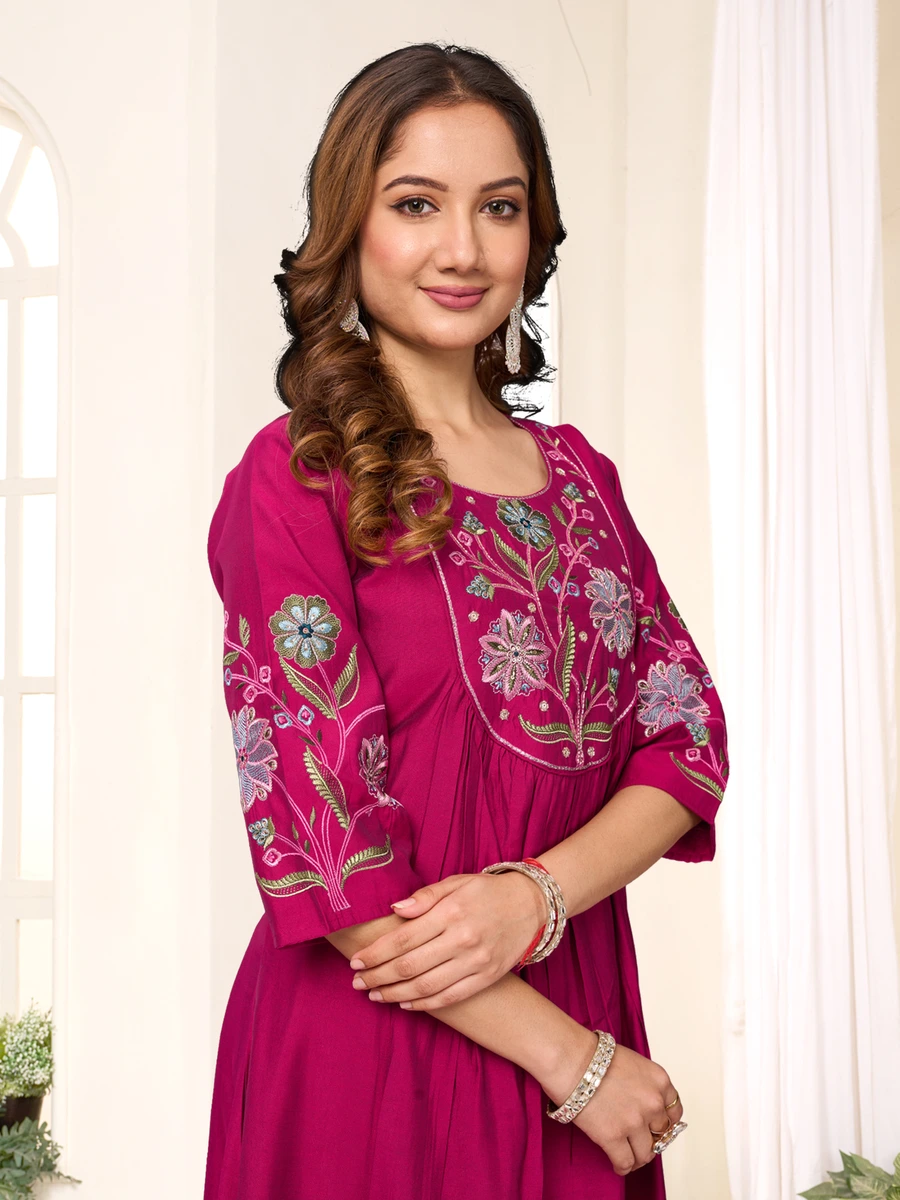KURTI FABRIC :- 14KG REYON WITH EMBROIDERY DESIGN WORK FULL STITCH NAYRA PATTERN KURTI