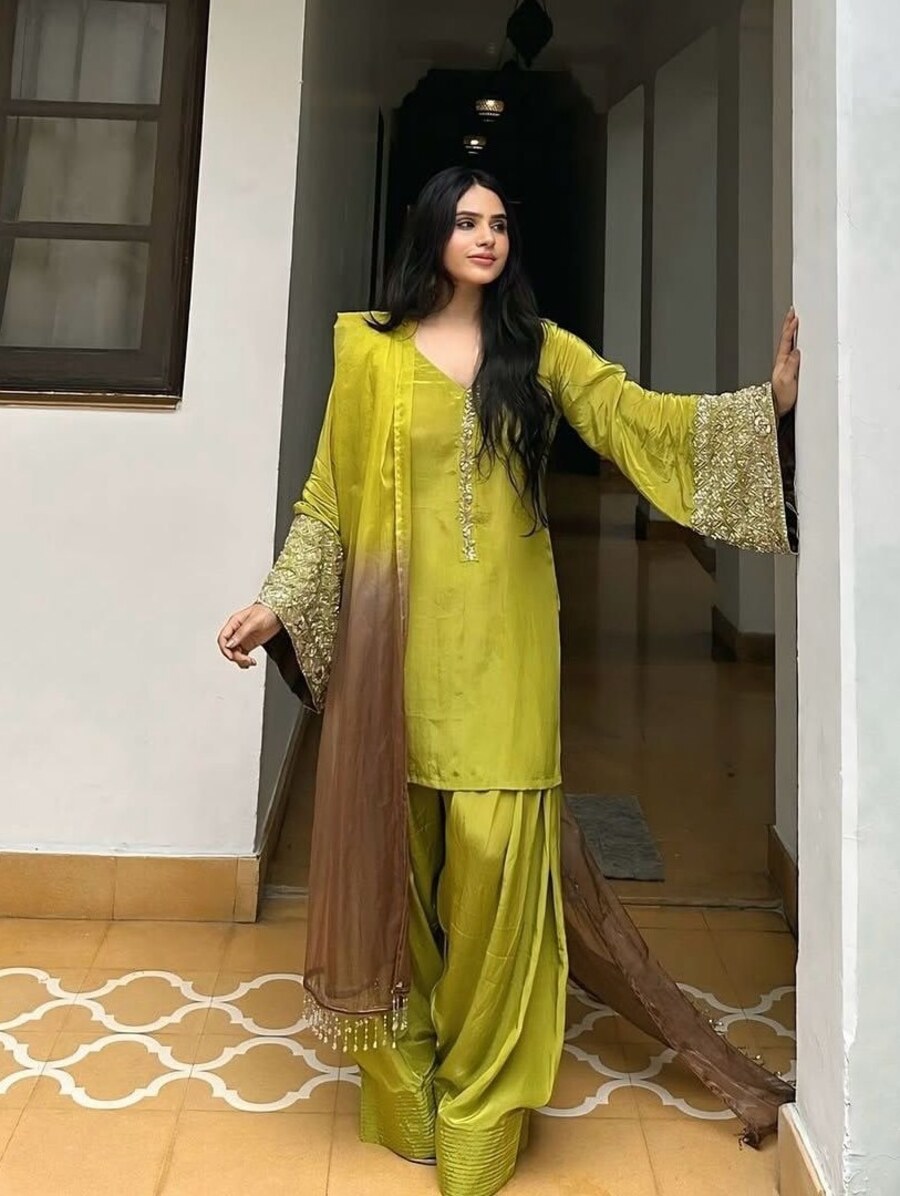 FANCY SATIN SILK EMBROIDERY SEQUENCE WORK TOP PATIYALA WITH DUPATTA LEMON