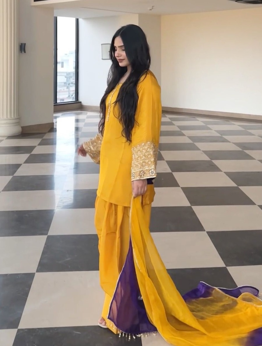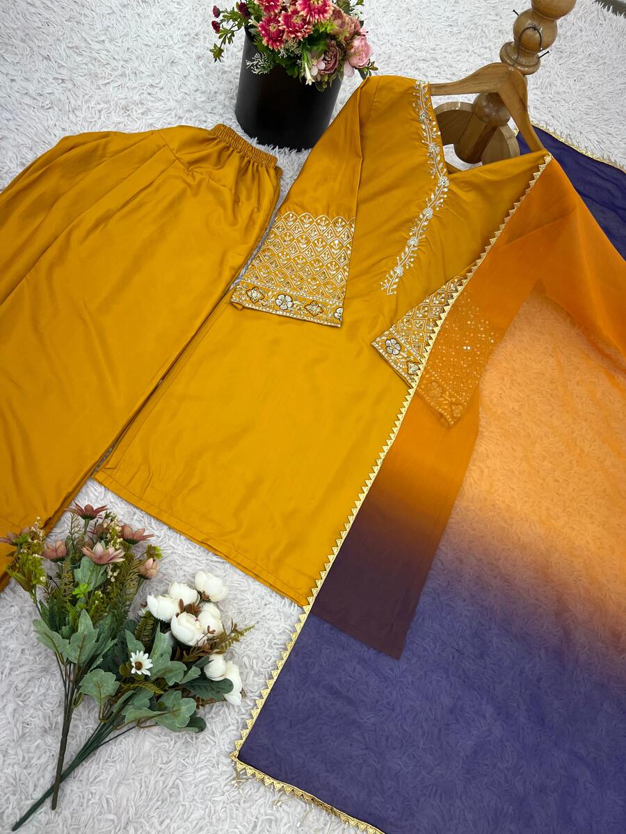 FANCY SATIN SILK EMBROIDERY SEQUENCE WORK TOP PATIYALA WITH DUPATTA YELLOW
