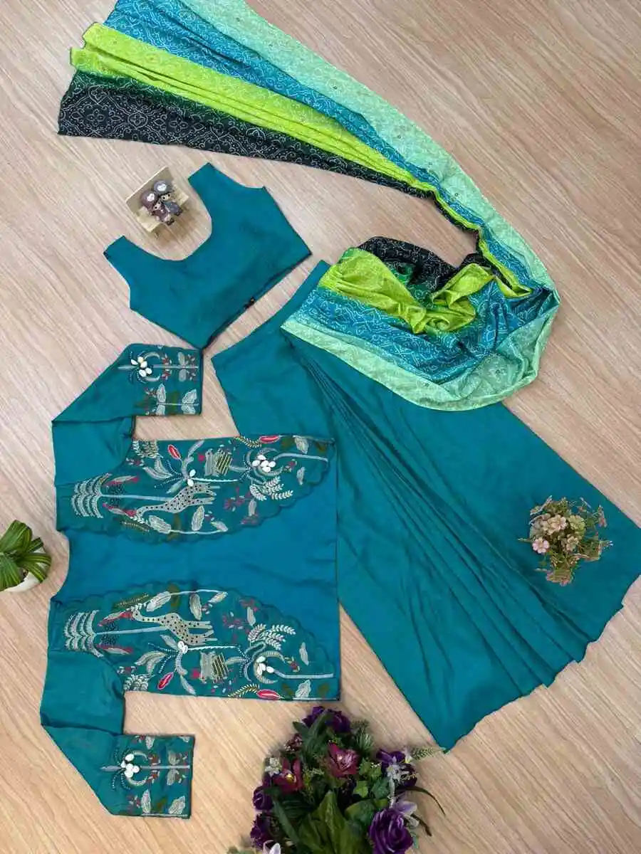 FANCY SHIMMER BANDHANI PRINT WORK LEHENGA SAREE WITH PLAIN BLOUSE AND EMBROIDERY HAND WORK KOTI RAMA