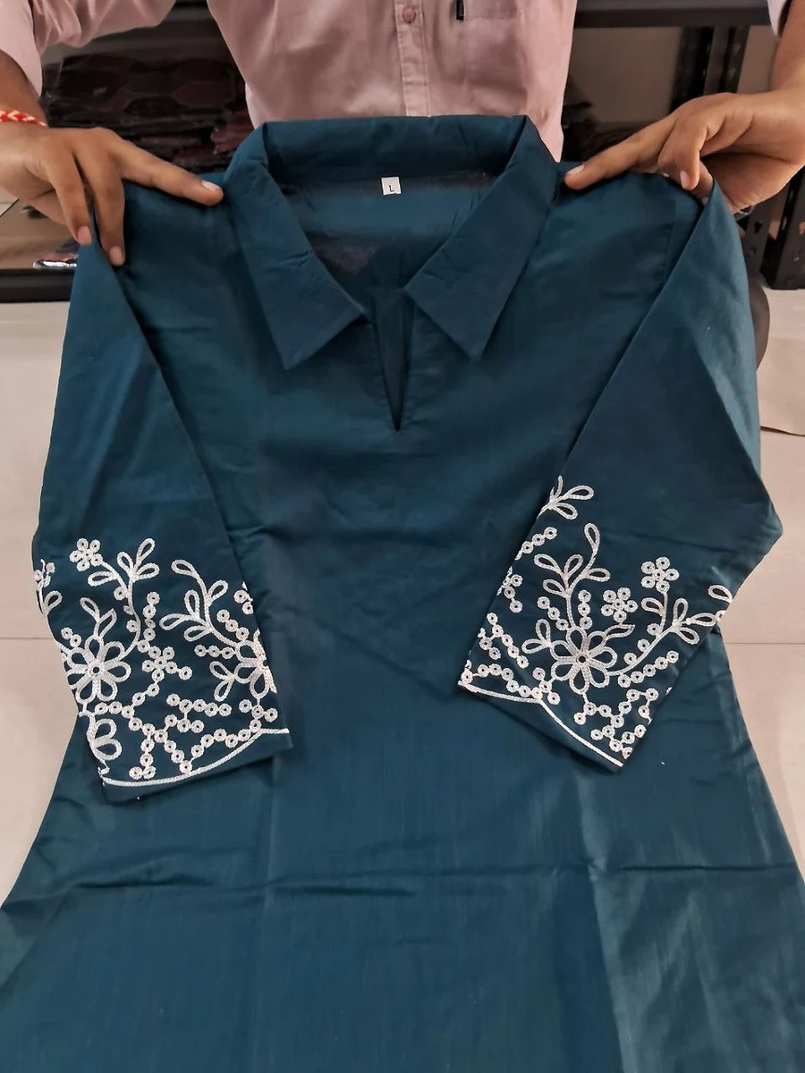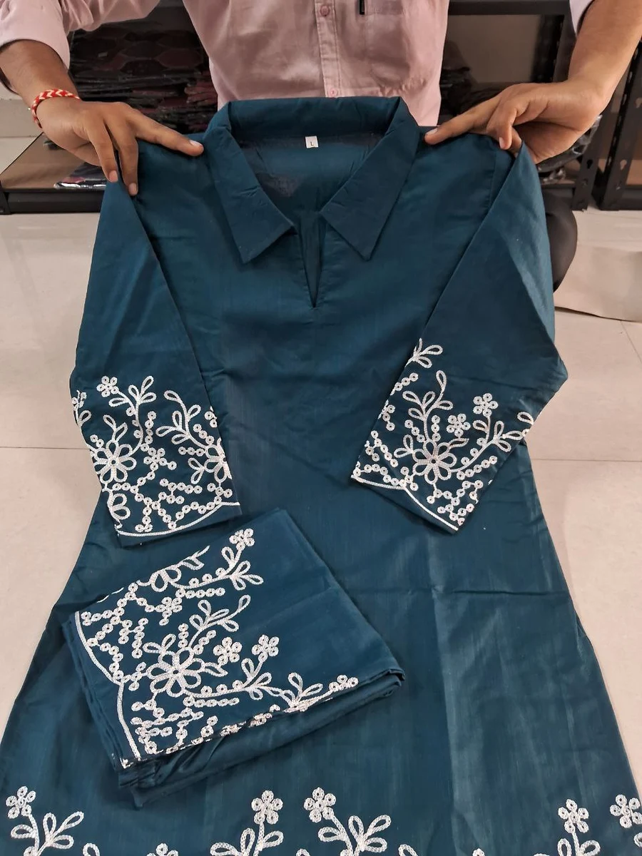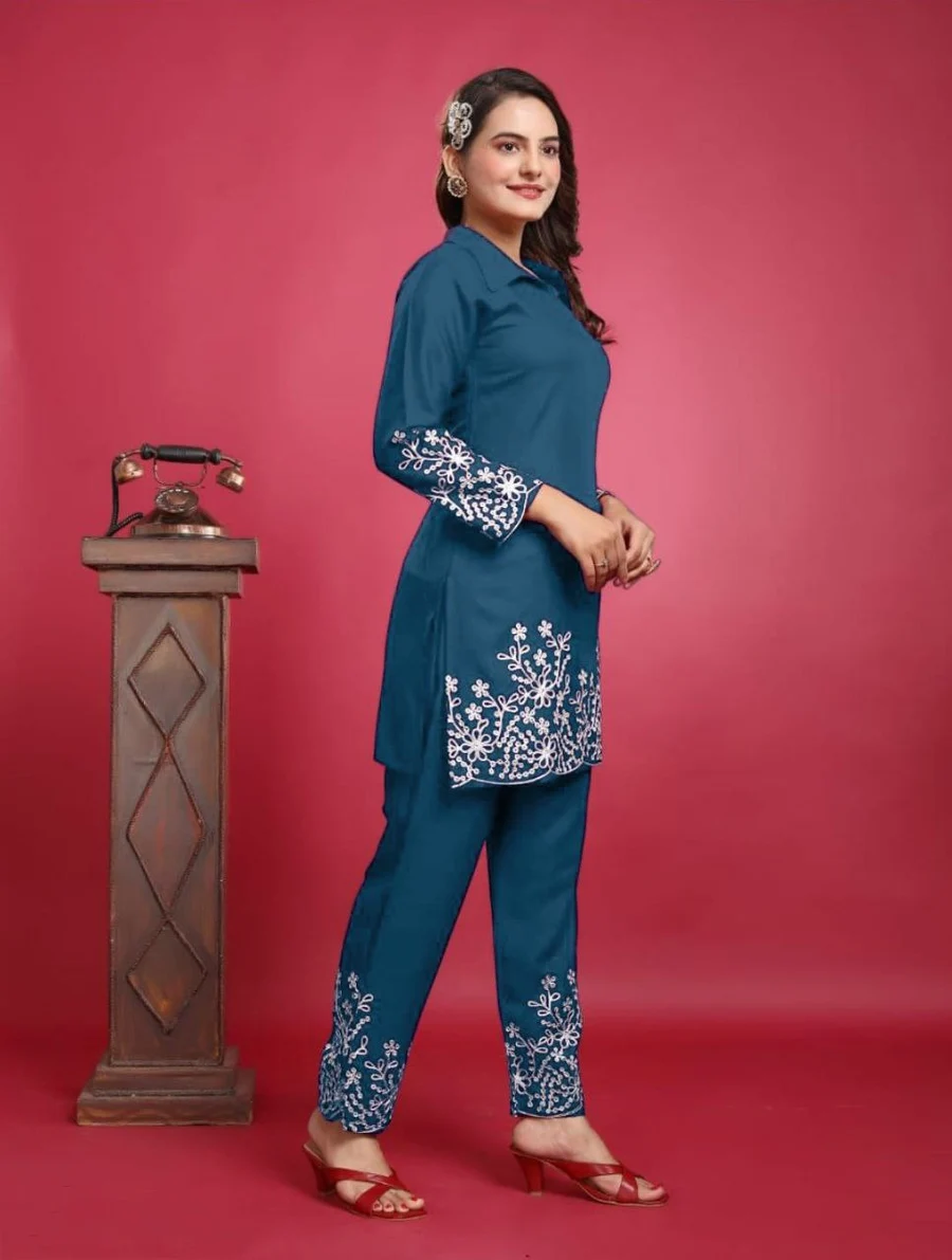 FANCY SLUB COTTON EMBROIDERY CHIAN WORK CO-ORD SET TEAL