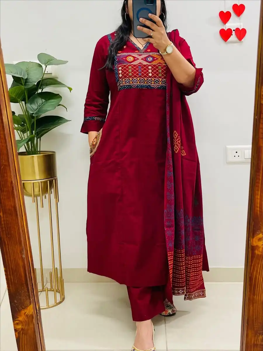 FANCY SLUB RAYON EMBROIDERY WORK TOP BOTTOM WITH DUPATTA MAROON