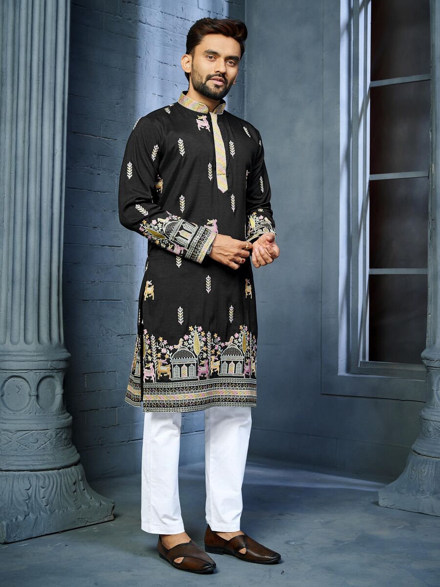 FANCY SOFT SILK MULTI THREAD EMBROIDERY WORK MEN’S KURTA PAYJAMA BLACK