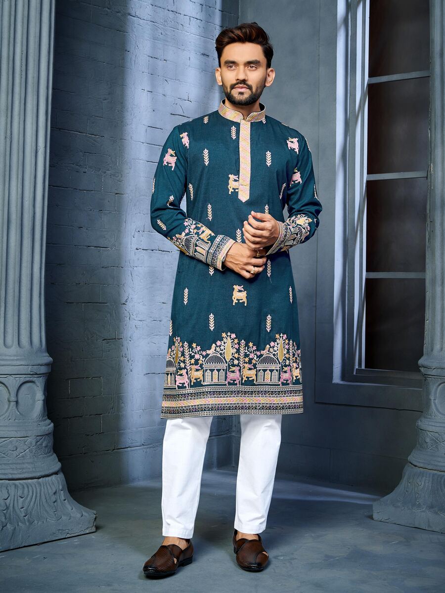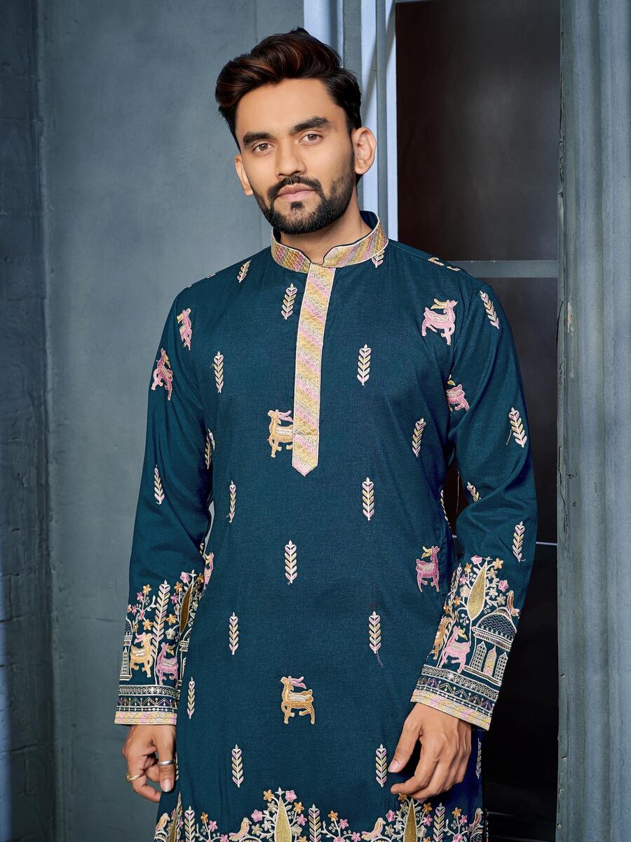 FANCY SOFT SILK MULTI THREAD EMBROIDERY WORK MEN’S KURTA PAYJAMA BLUE