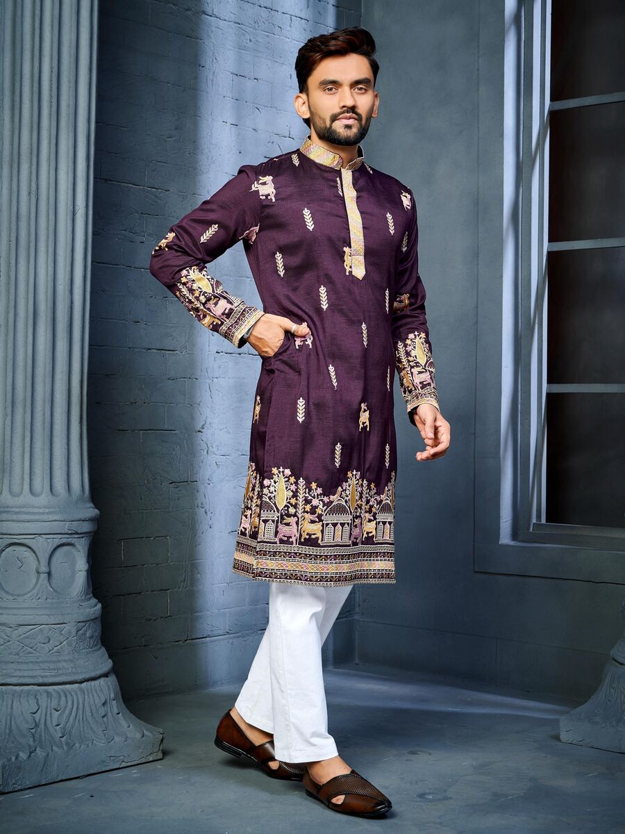 FANCY SOFT SILK MULTI THREAD EMBROIDERY WORK MEN’S KURTA PAYJAMA PURPLE