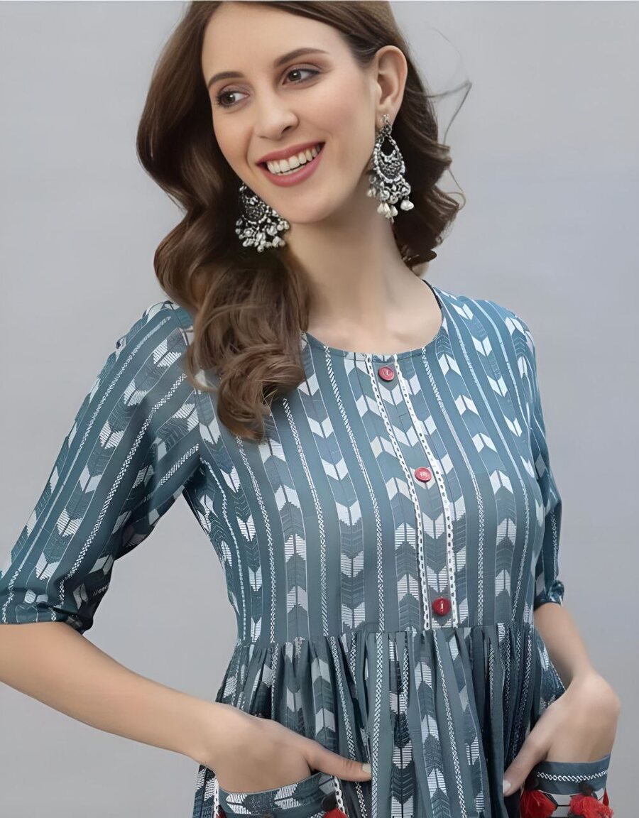 KURTI:-14KG RAYON WITH FOIL PRINT WITH BEAUTIFUL EMBROIDERY SEQUENCE PATTERN WORK