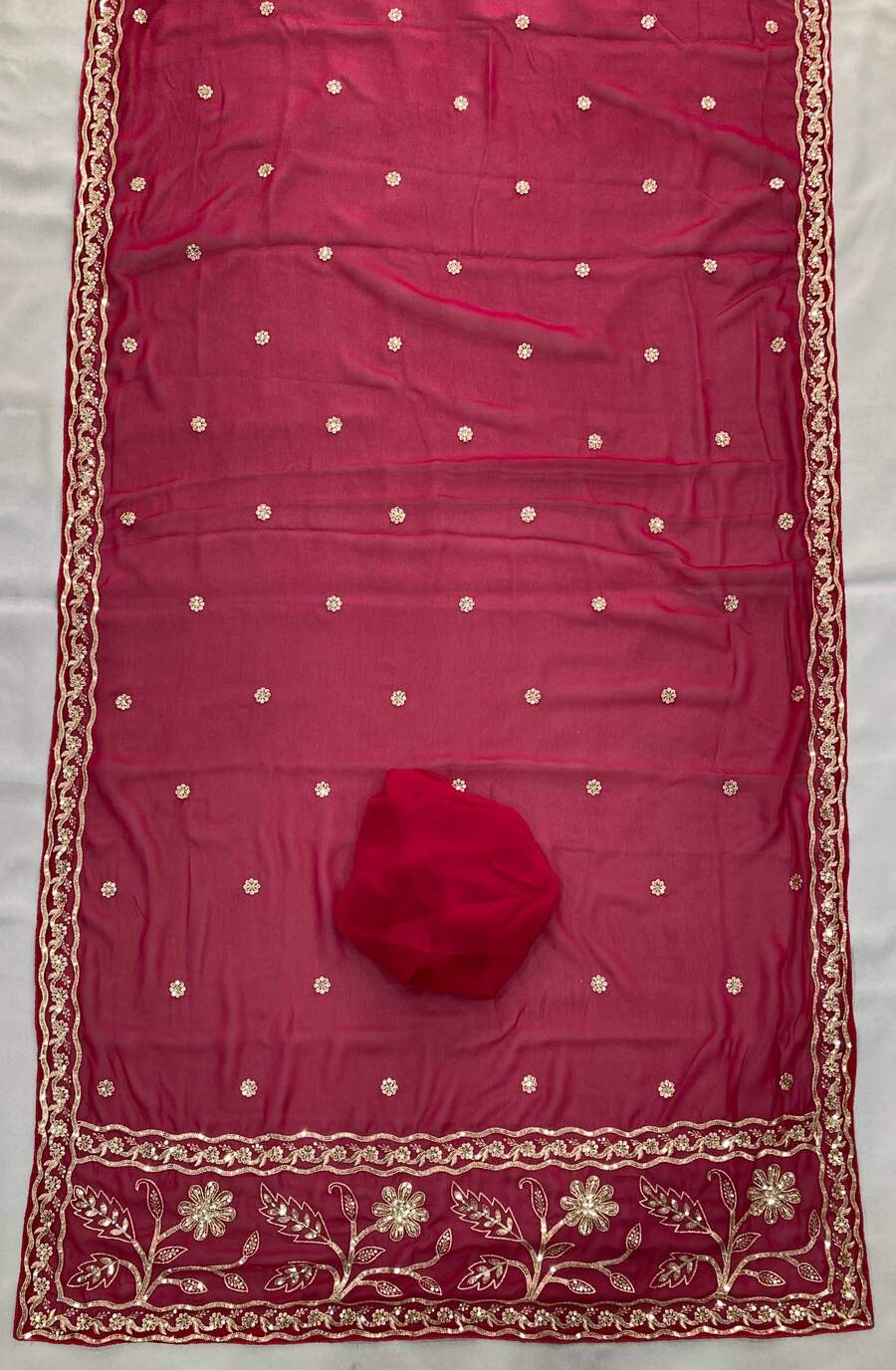 SAREES FABRIC :- JIMMY CHOO FABRIC WITH DUAL COLOUR SEQUENCE AND THREAD EMBROIDERY WORK AND ARC CUT BORDER WITH ALL OVER BUTTA WORK