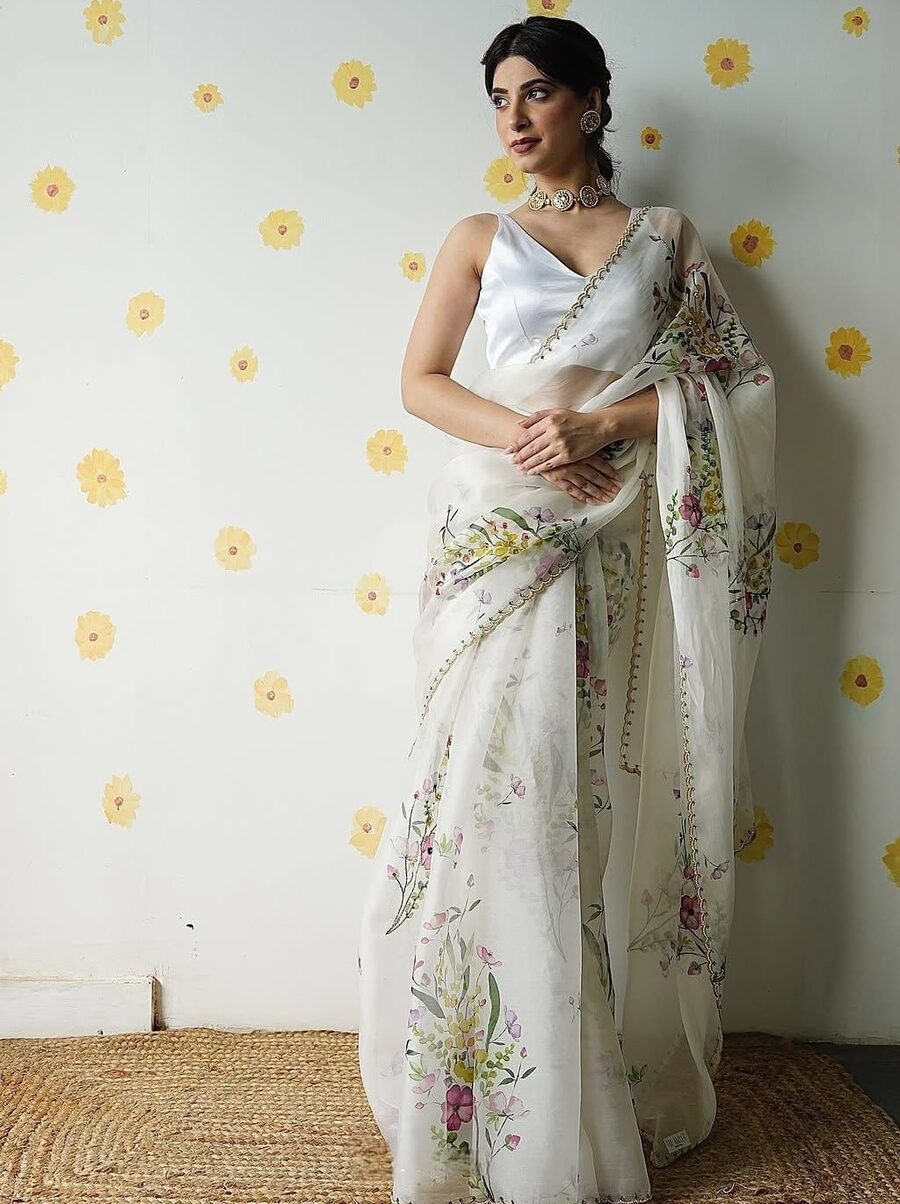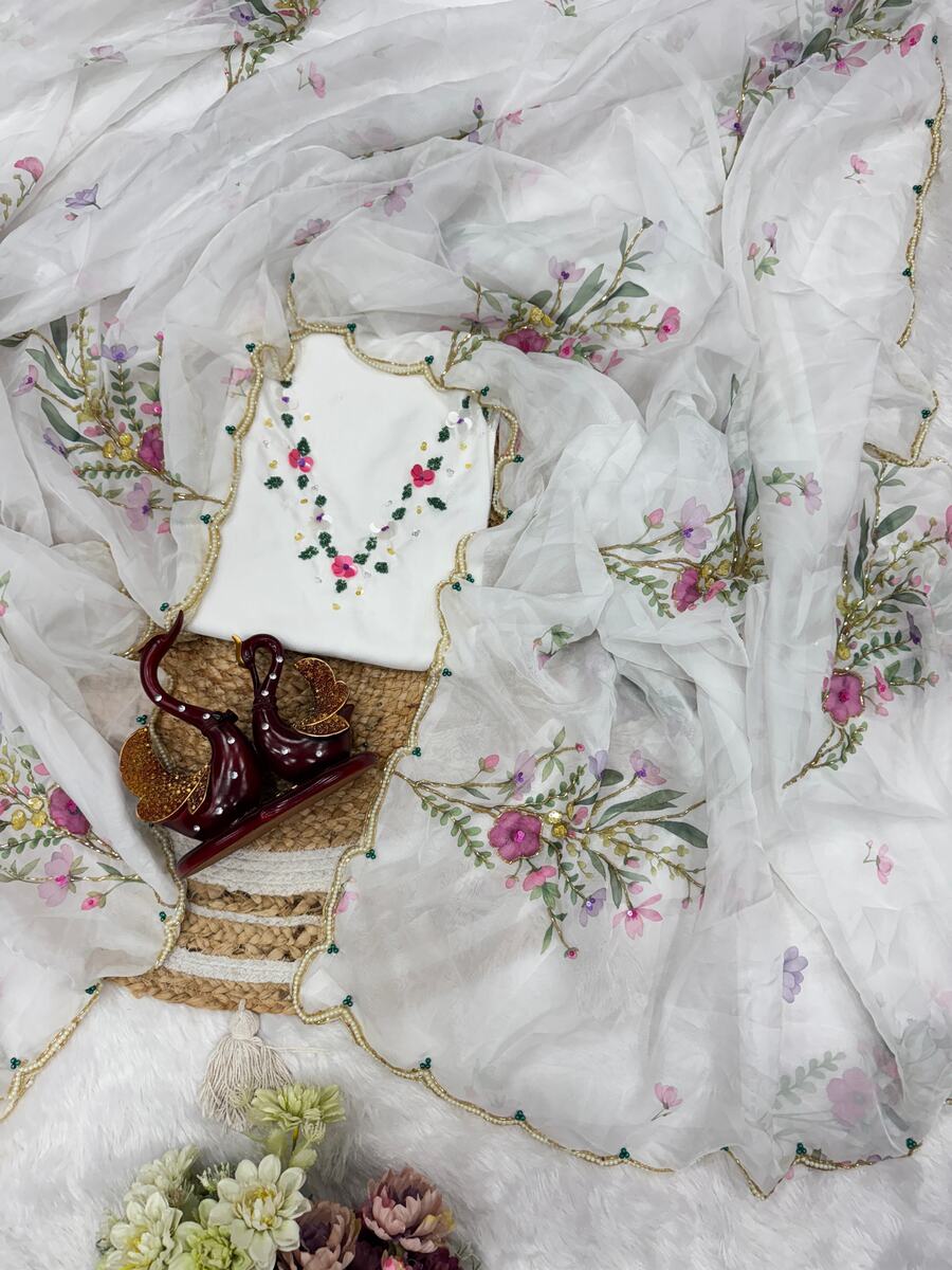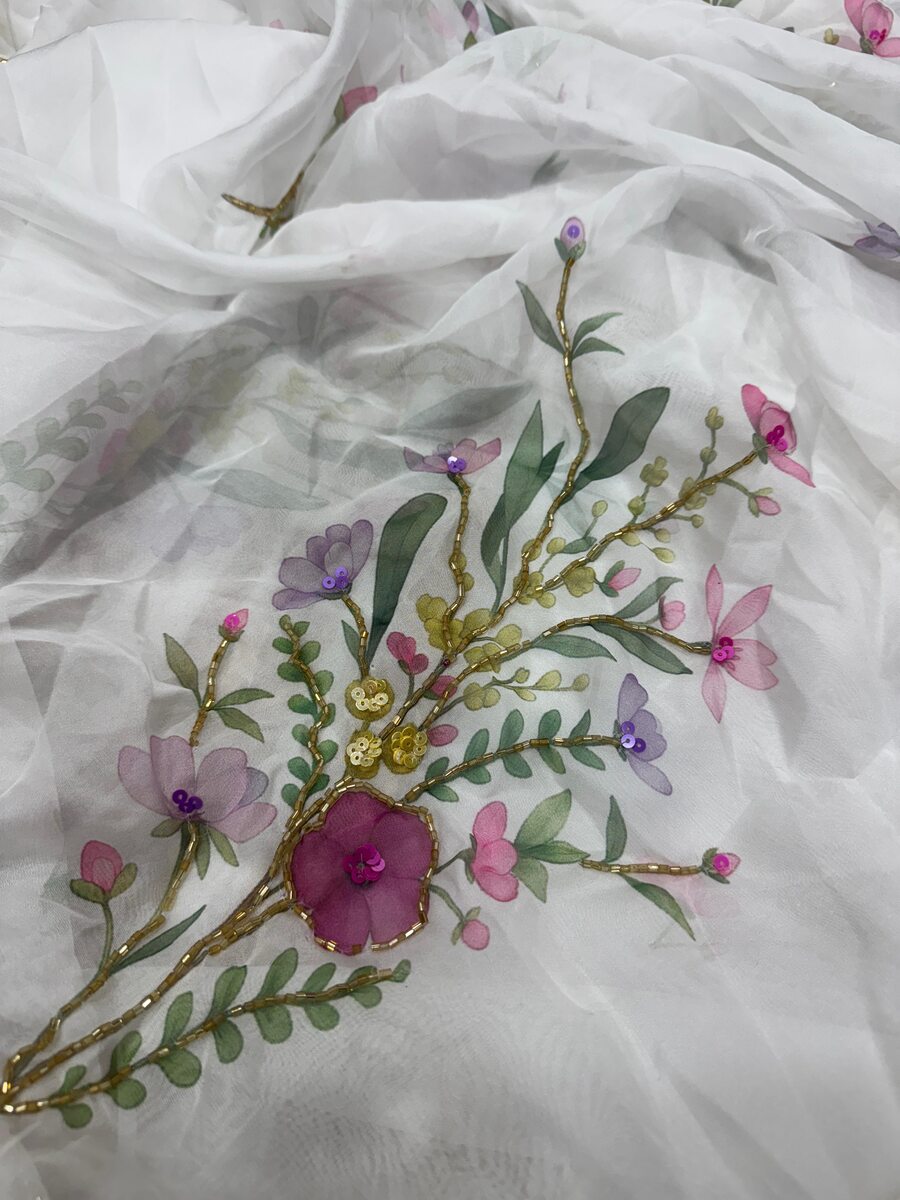 FANCY TABBY SILK FLORAL PRINT WITH BEADS, SEQUENCE AND CUT DANA HANDWORK SAREE WITH UNSTITCHED BLOUSE WHITE